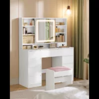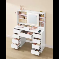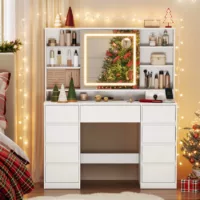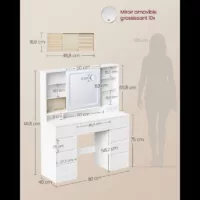 Kailyn – Coiffeuse 9 tiroirs loupe 10x éclairage 3 couleurs blanc nuage