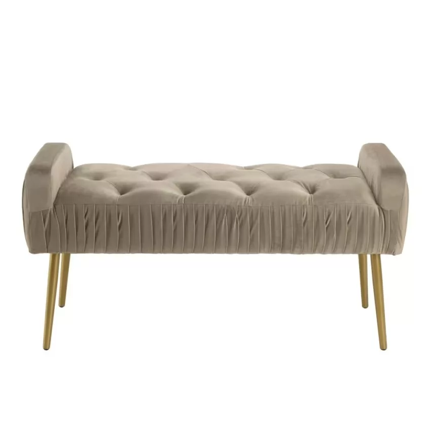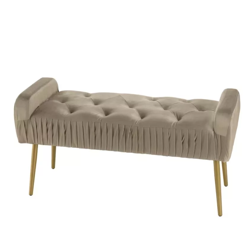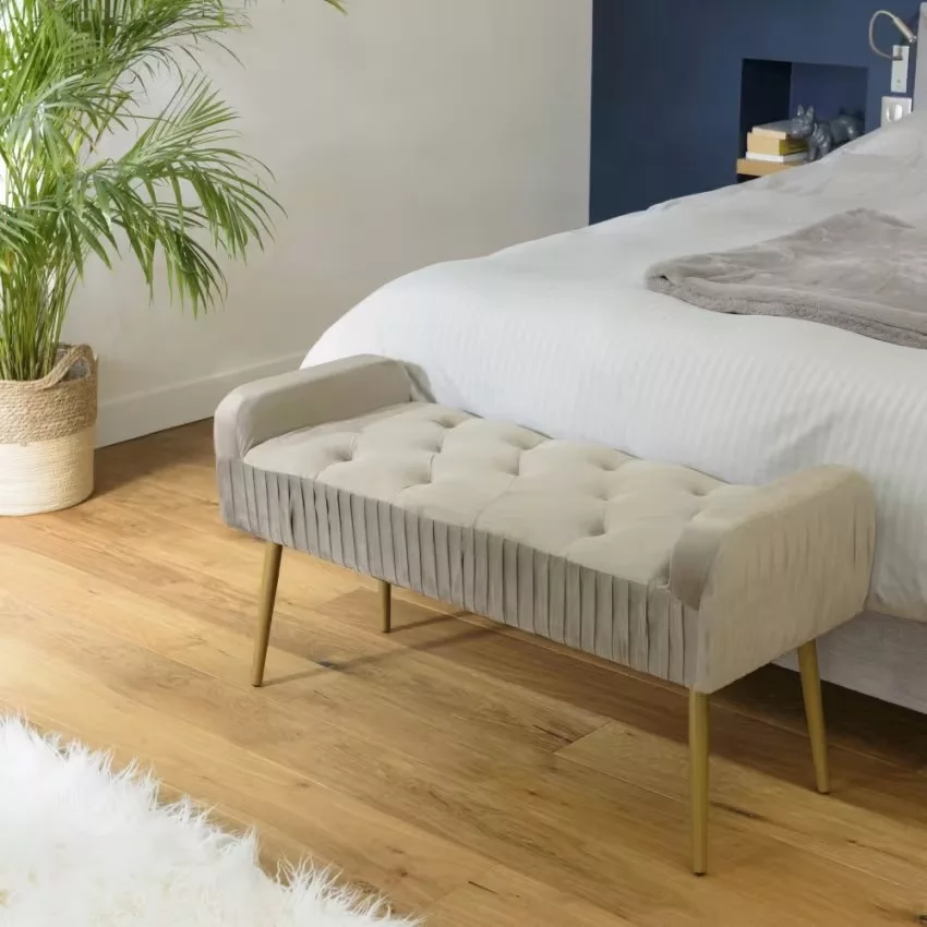Banc de lit velours taupe pieds métal doré. Dimensions : 103 x 40 x 53 cm. Article en Velours polyester / Mousse / Acier / Contreplaqué. Succombez à l’élégance de ce joli banc de lit en velours capitonné ! Les teintes neutres et chics se marient avec de nombreux styles de décoration. Ses pieds en métal doré donnent un look tendance. La douceur des matières est un réel avantage qui offre une assise très confortable Cet article trouvera sa place dans une chambre, une entrée ou un bureau !