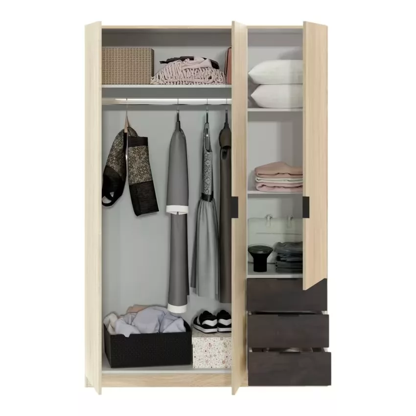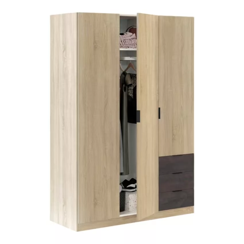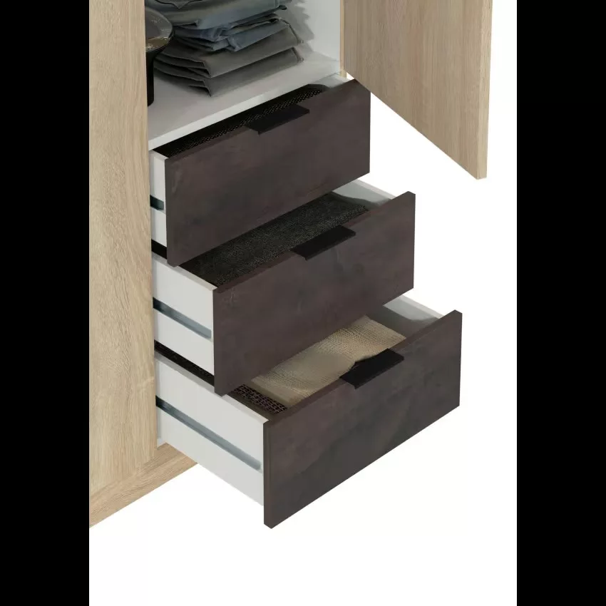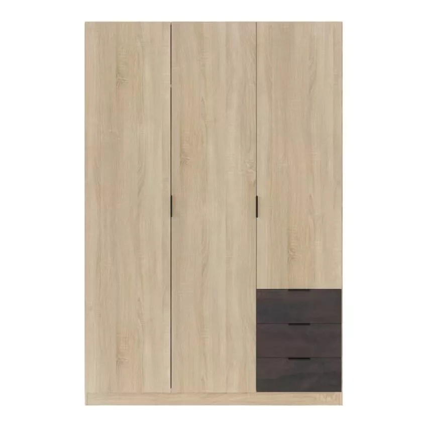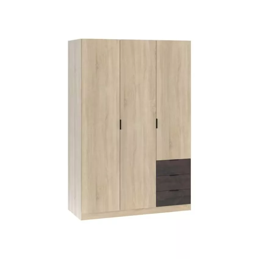 ARMOIRE 3 PORTES – Armoire de chambre avec 3 portes et 3 tiroirs, Armoire avec tringle à vètements et 3 ètagères, 121x52h180 cm, Chène et Oxyde. STRUCTURE ET UTILISATION – Armoire complète de trois portes battantes, trois tiroirs, intèrieurement trois ètagères fixes (dont deux ètagères dans la porte droite règlables en hauteur), grâce à l’organisation interne de ses espaces elle offre un grand espace de rangement – L’ensemble la structure du meuble est parfaite pour meubler une chambre double, une chambre d’enfant ou une chambre d’amis de manière peu encombrante – Les ètagères internes combinèes à la barre porte-vètements vous permettront de ranger vètements et vètements de manière ordonnèe – Convient pour contenant des accessoires, des sacs, des chaussures ou des vètements. CERTIFICATIONS ET INNOVATIONS – Article d’ameublement design certifiè PEFC, parfait pour meubler un environnement moderne et lumineux: le produit idèal pour ceux qui recherchent un produit fonctionnel et peu encombrant pour leur maison ou leur appartement – Garantie de 2 ans à partir de la date d’achat – Livrè dèmontè avec un livret d’instructions de montage. CARACTÉRISTIQUES TECHNIQUES – Produit rèalisè en bois lamellè d’une èpaisseur de 15 mm, un matèriau rèsistant aux chocs et aux rayures, durable et impermèable – Chants avec finition en mèlamine d’une èpaisseur de 0,6 mm – Dossier mobile blanc en MDF avec èpaisseur de 3 mm – Charnières mètalliques pour les portes, glissières mètalliques coulissantes pour les tiroirs non extractibles – Cales ABS anti-bruit et anti-rayures pour la partie basse du meuble – Aluminium laquè poignèes blanches – Tube cintre amovible en aluminium – Poids maximum supportè du produit: 50 Kg – Poids maximum supportè de l’ètagère: 5 Kg – Poids maximum supportè du tube cintre: 8 Kg – Poids maximum supportè du tiroir: 5 Kg. DIMENSIONS EN CM – Armoire: Longueur: 121 Largeur: 52 Hauteur: 180 – Capacitè tiroirs: 35x45h13
