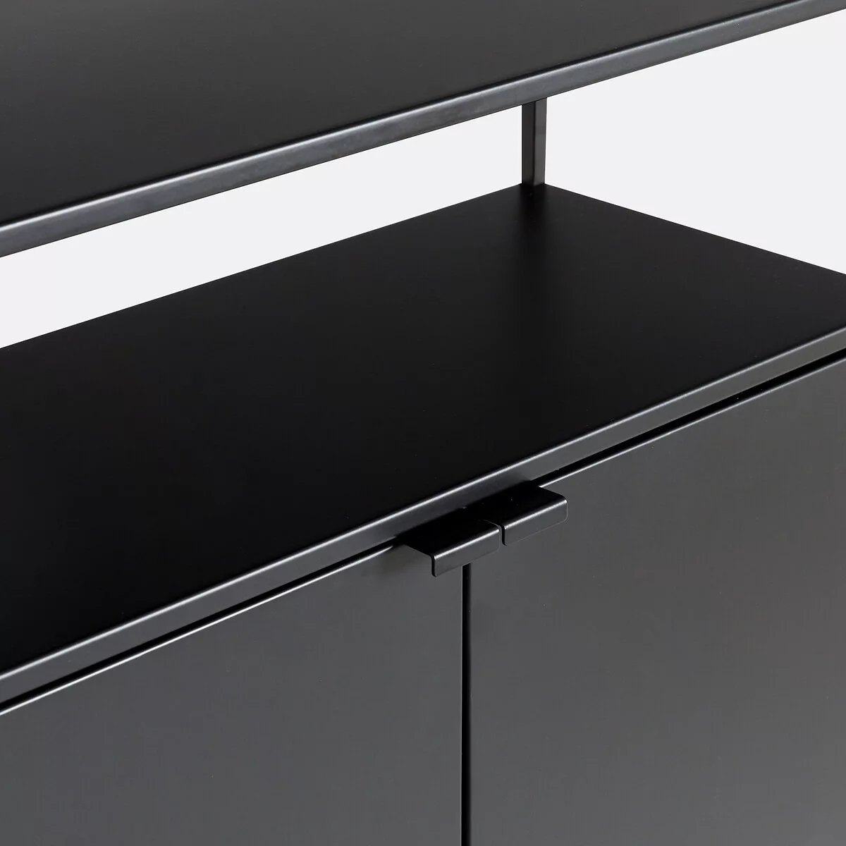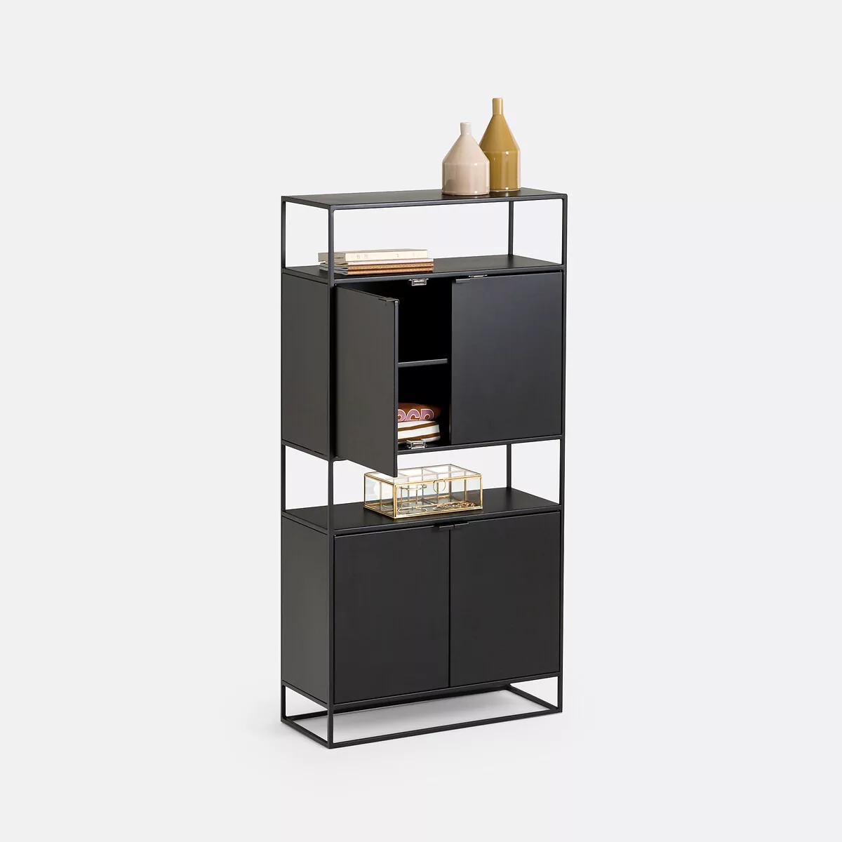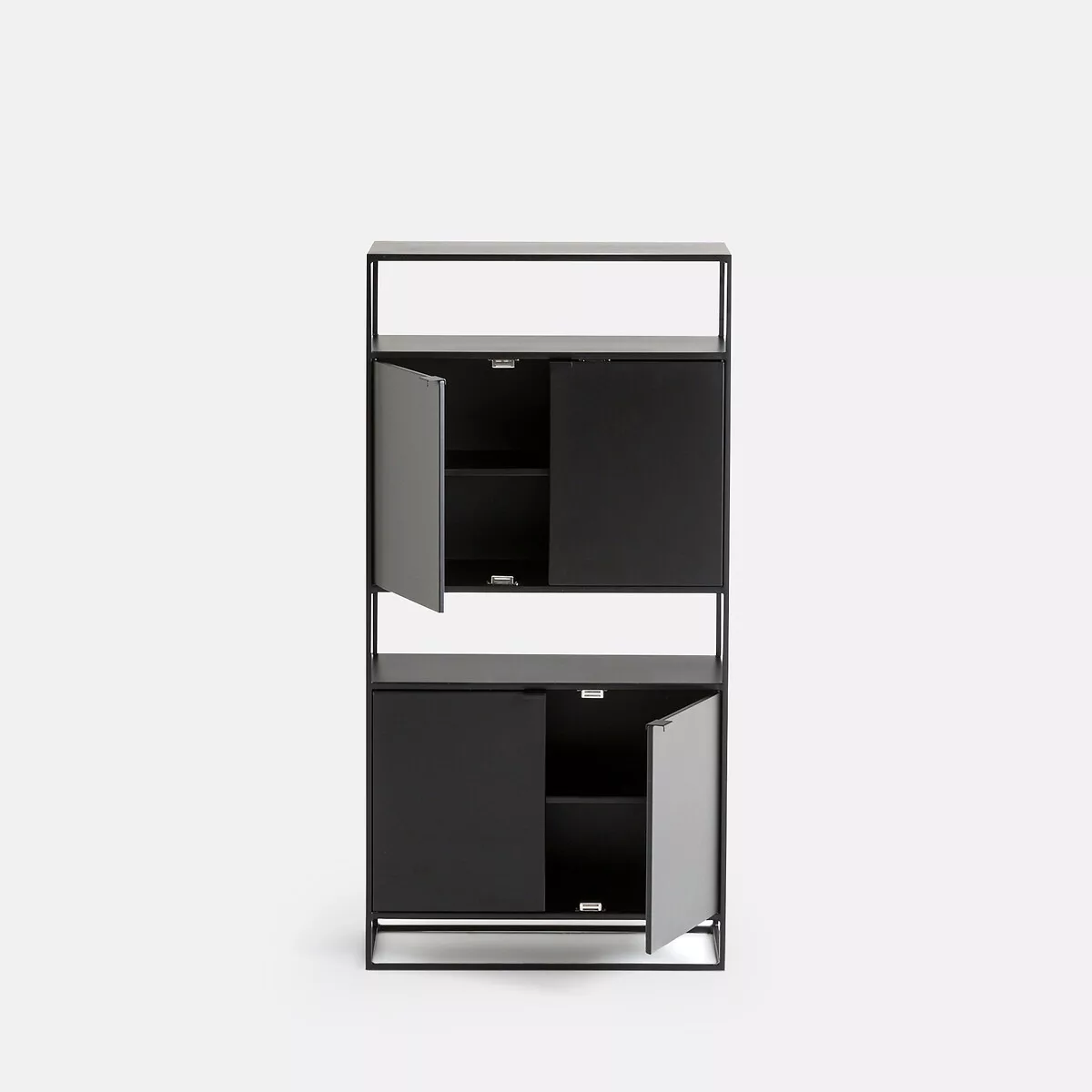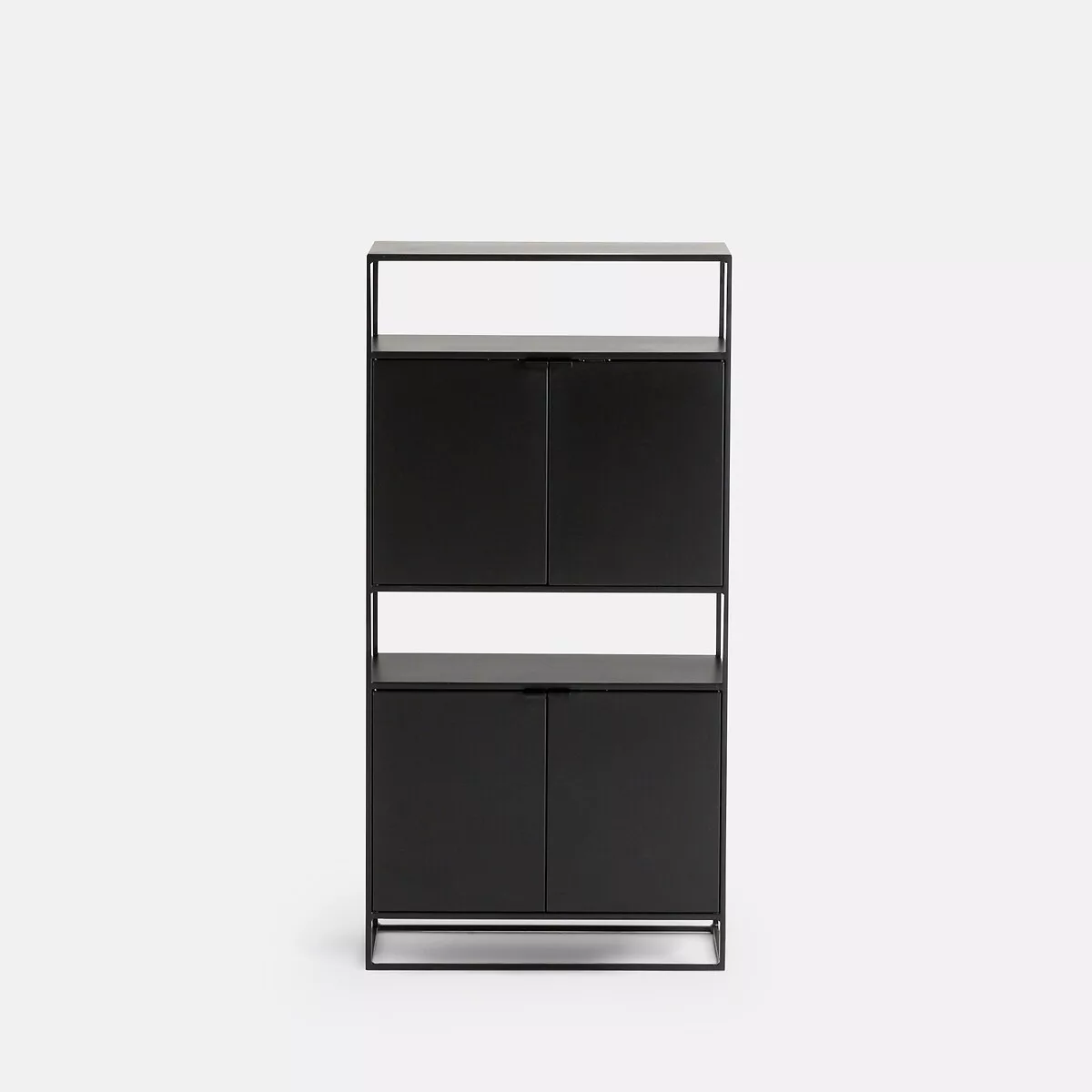 • Armoire 4 portes avec 1 étagère dans chaque caisson ajustable en hauteur + 2 espaces de rangement ouverts + 1 étagère avec le plateau supérieur