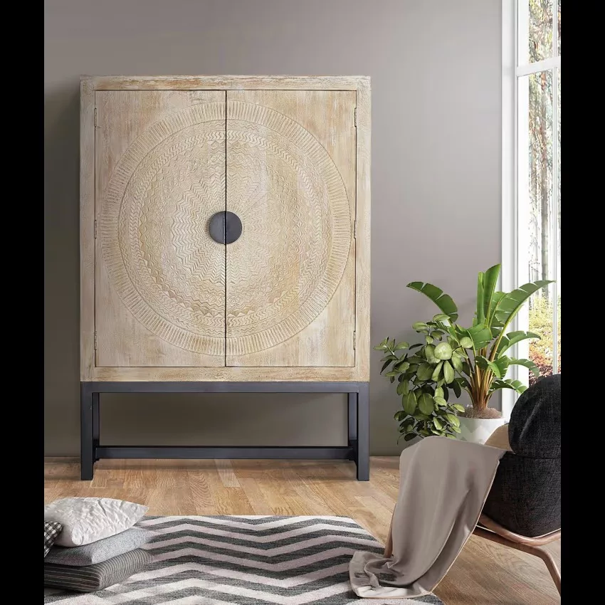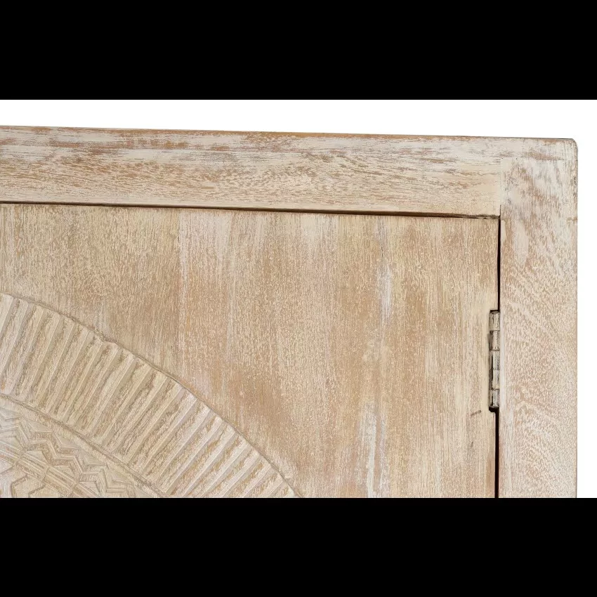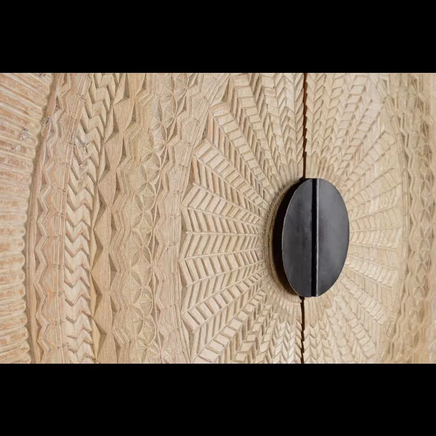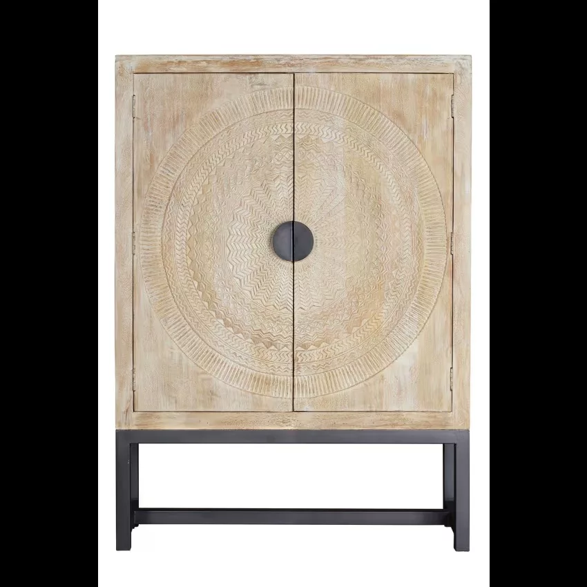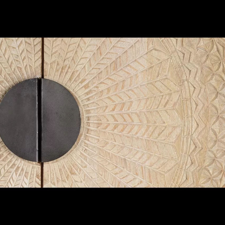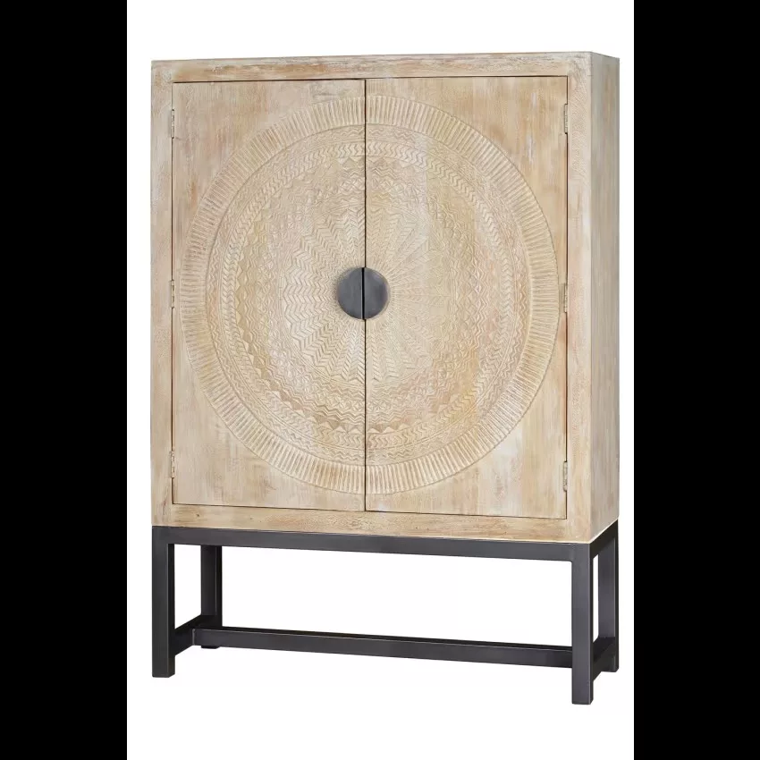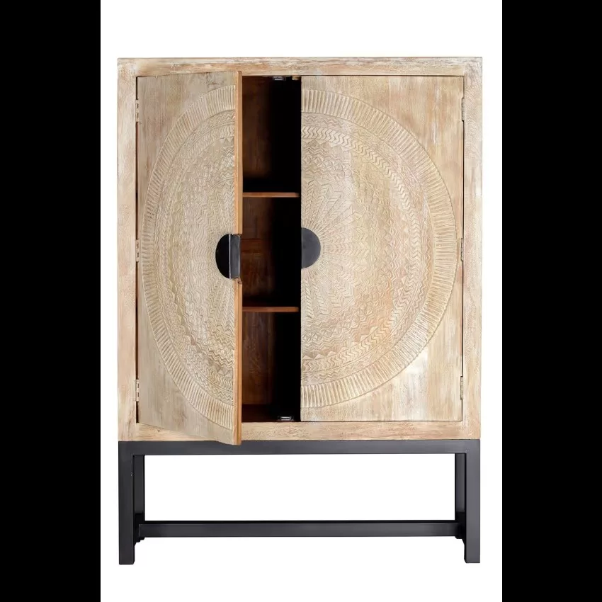 Armoire 2 portes en bois de manguier. Sculpture circulaire sur les portes. Base de métal. 2 étagères intérieures. Finition blanchie pour mettre en valeur les détails de la sculpture.Mesures : 176 cm de haut X 124 cm de large X 42 cm de profondeur. Volume : 0.91m3. Poids 90 kg. *Il peut présenter une couleur plus blanche que sur l’image en raison des traitements du bois pour assurer sa durabilité. TRÈS IMPORTANT! PRODUIT ASSEMBLÉ! Avant de procéder à l’achat, nous vous recommandons fortement de vérifier les dimensions des entrées de votre maison ou de votre chambre, ainsi que l’espace disponible dans la cage d’escalier et la dimension de l’ascenseur, le cas échéant. Cela garantira que les meubles sélectionnés pourront être transportés et installés sans accroc. Votre collaboration est essentielle pour une expérience d’achat satisfaisante! Étant donné qu’il s’agit d’un meuble en bois naturel et fabriqué à la main, il peut conserver ses nœuds et ses veines d’origine et peut donc présenter des différences en ce qui concerne la couleur.