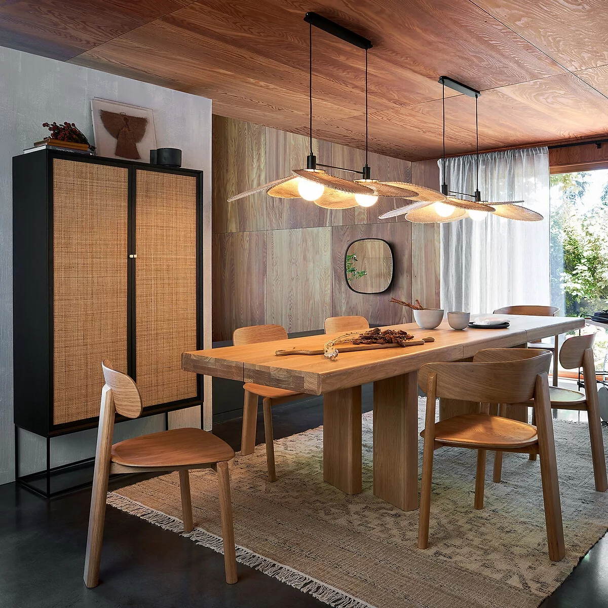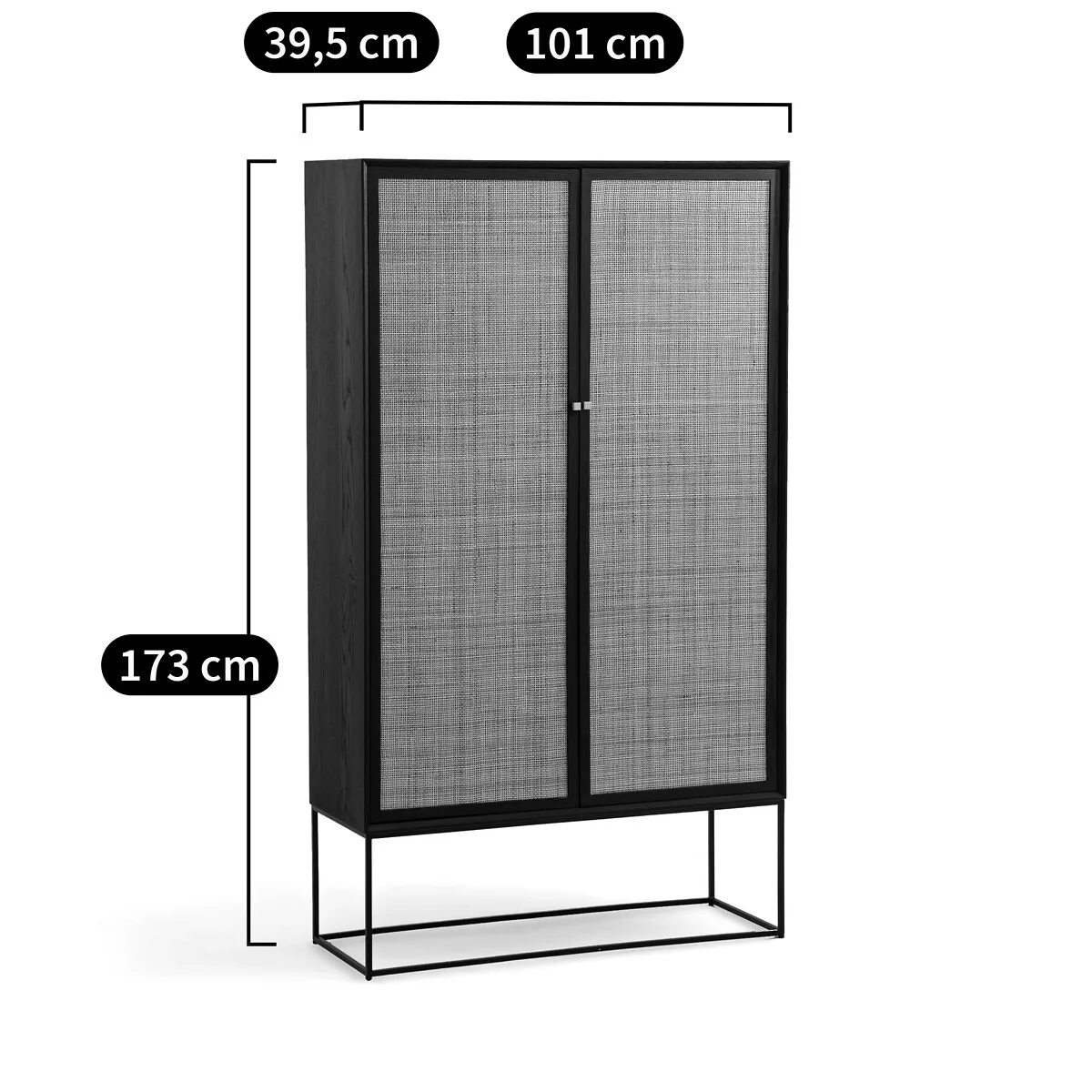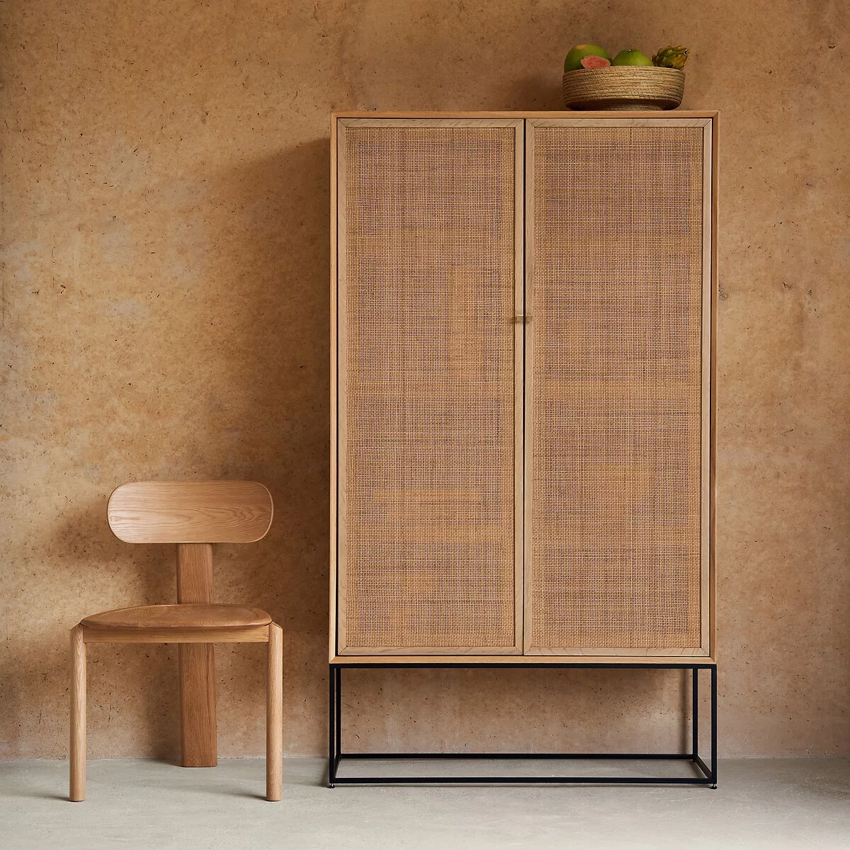 L’armoire Tamaroa séduit par l’alliance harmonieuse de sa structure plaquée chêne encadrant deux portes en rotin et soutenue en toute légèreté par un piétement en métal.
