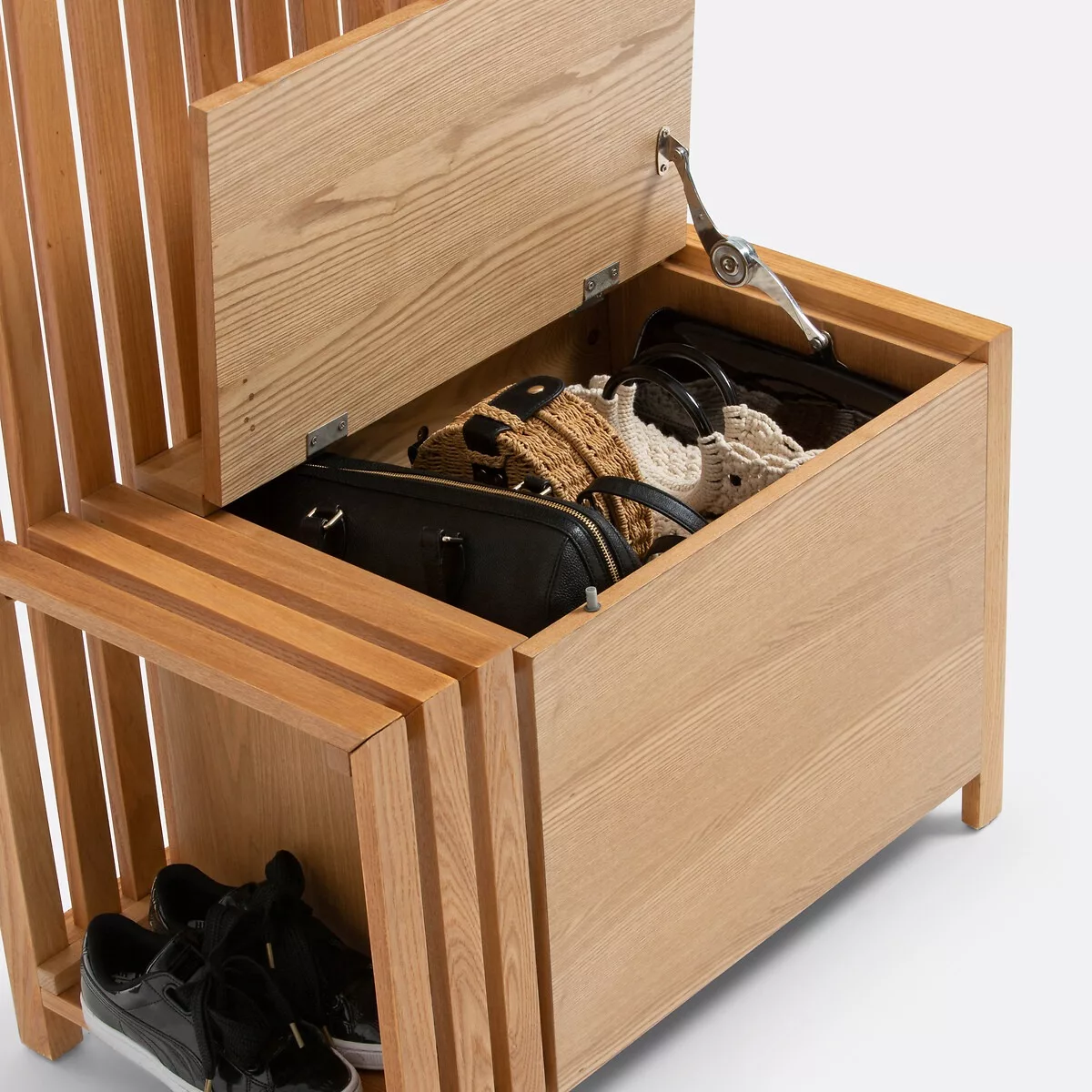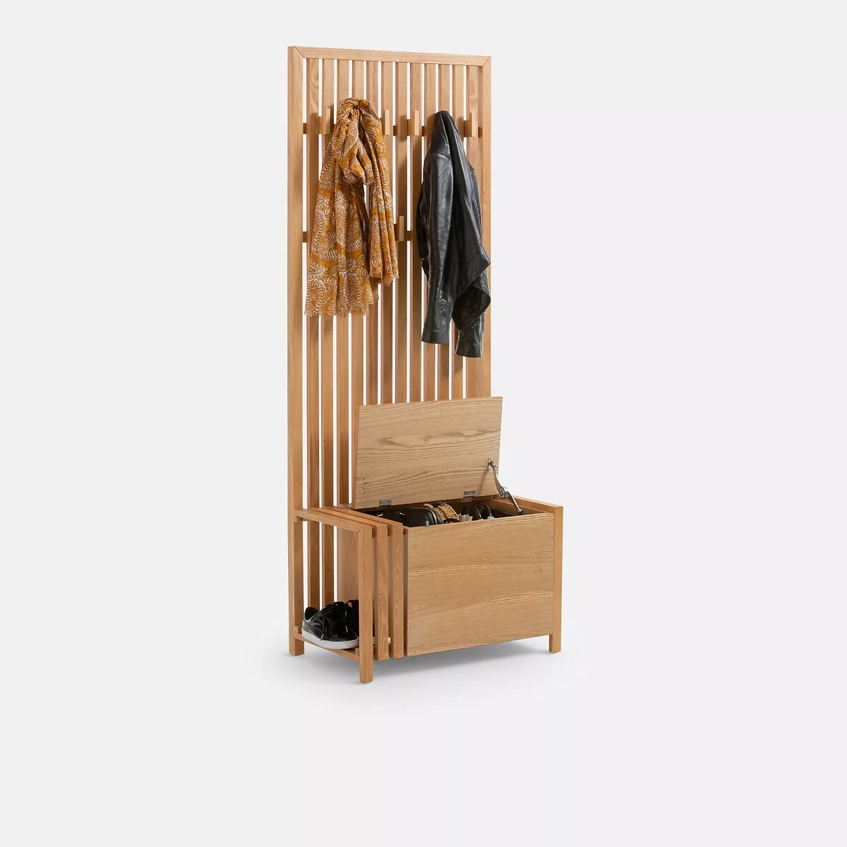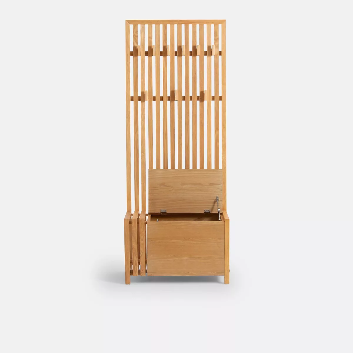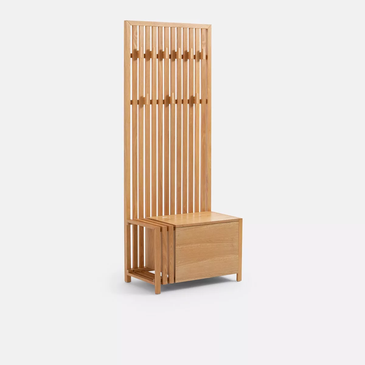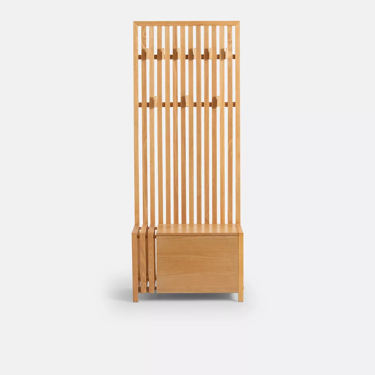 • Banc d’entrée avec coffre de rangement, paroi murale à lattes pouvant servir de séparateur de pièce, avec 9 patères amovibles à répartir sur 2 rangées.