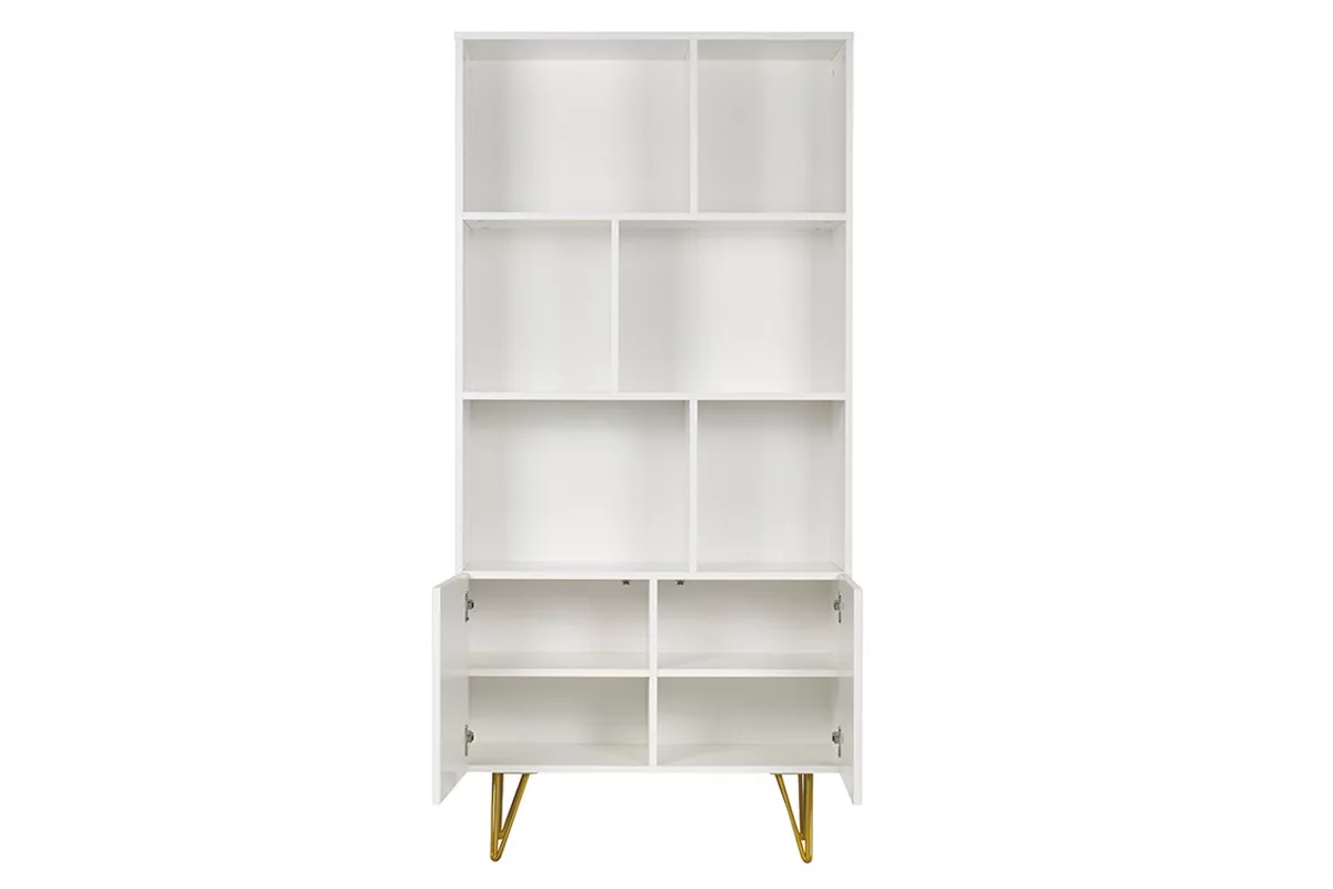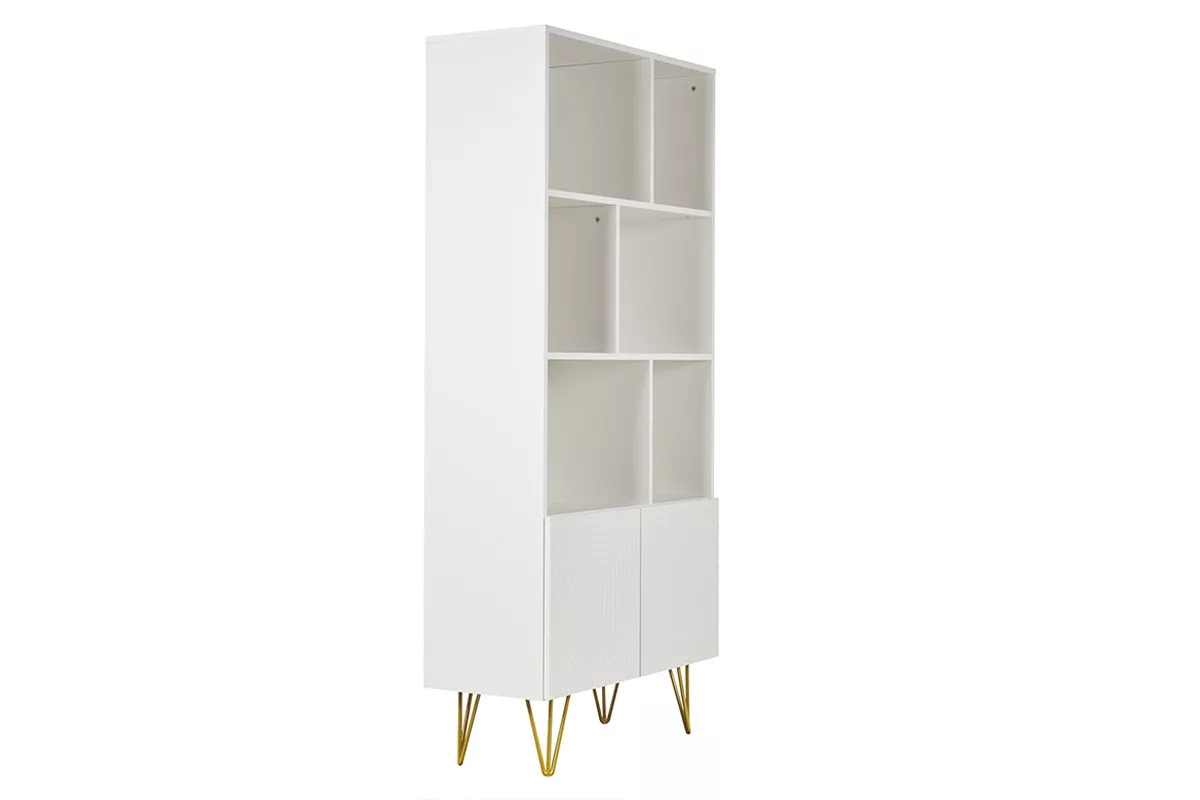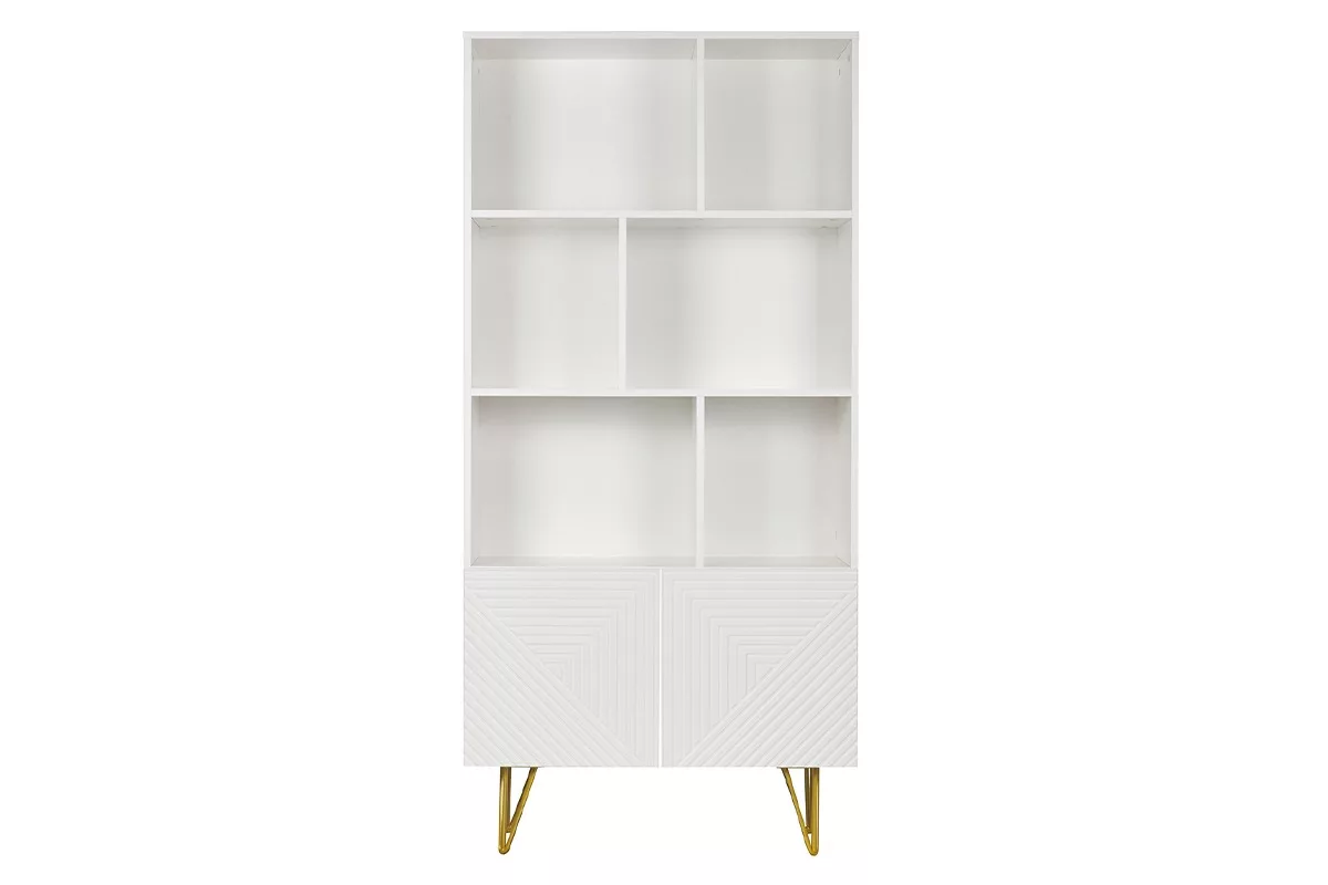 Ce meuble de rangement a tout d’ultra moderne ! Look white & gold, piètement épingle, portes gravées : tout y est pour faire craquer les amateurs de décoration contemporaine. Cette bibliothèque haute (L86 x P35 x H180 cm) au look épuré a su travailler son style avec finesse ! D’apparence minimaliste, OZEN est une bibliothèque blanche et dorée sur laquelle une attention particulière a été portée sur les détails. Résultat ? Un meuble 100% tendance prêt à donner une touche d’éclat à votre décoration d’intérieur !