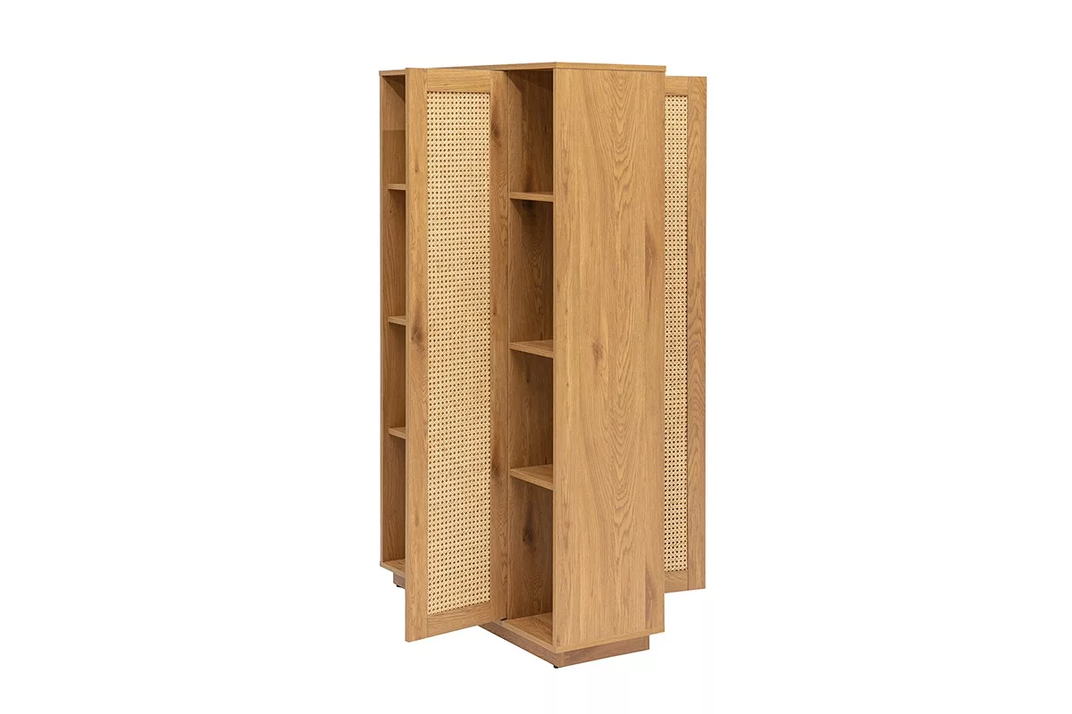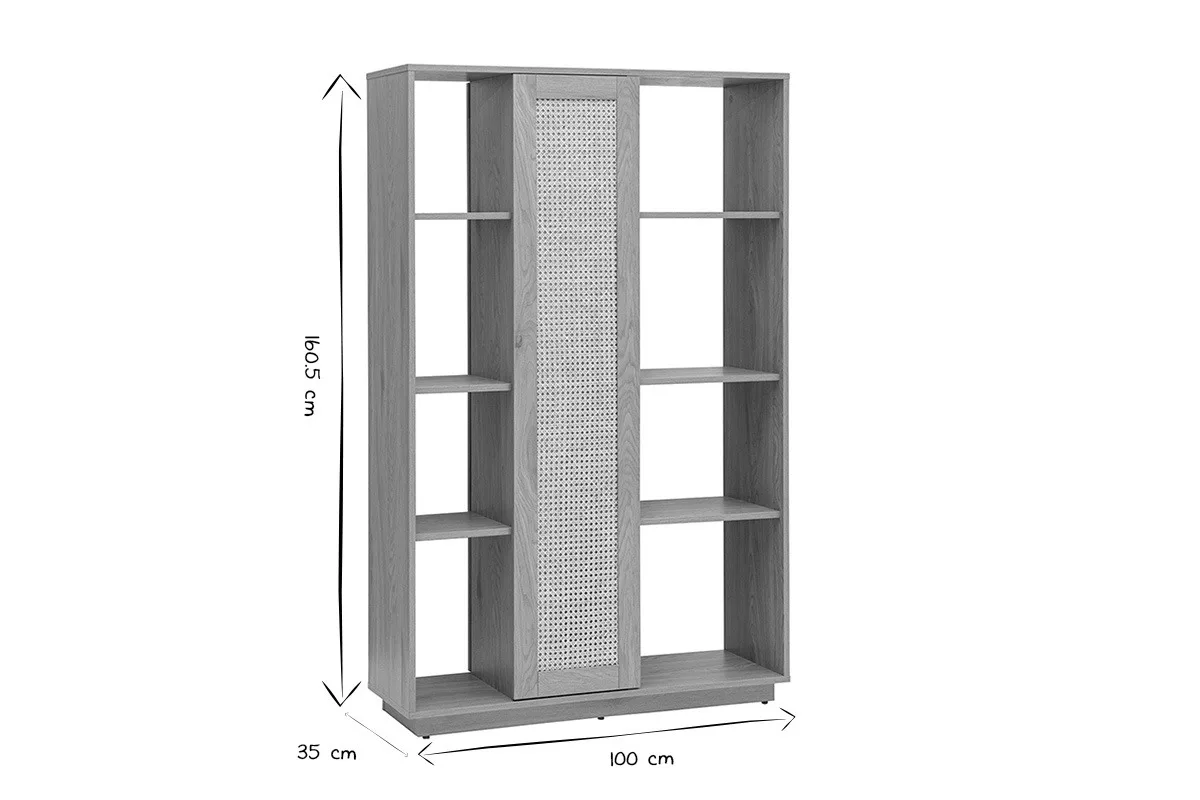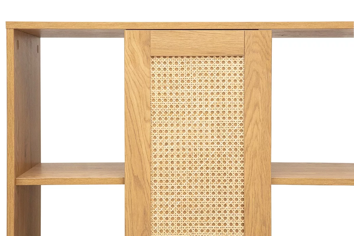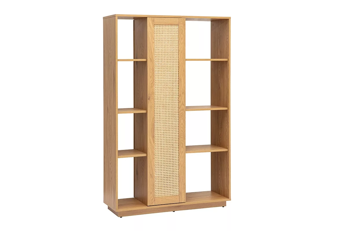 Pensée pour répondre aux besoins de rangement et d’organisation moderne, cette bibliothèque séparatrice dispose de multiples étagères ouvertes sur toute la hauteur. Elles permettent de disposer livres, objets déco, plantes, cadres, souvenirs ou paniers de rangement selon vos envies. Au centre, une porte en cannage rotin offre la possibilité de masquer discrètement certaines niches tout en apportant du caractère à la façade.