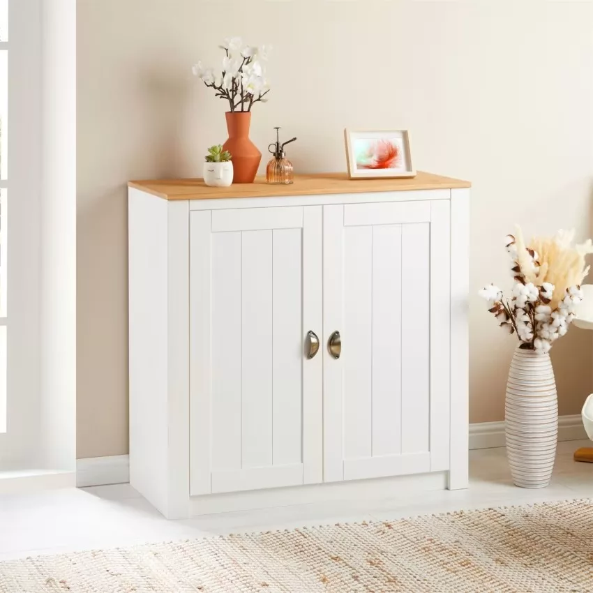 – Le buffet est fabriqué en pin massif et recouvert d’une lasure de coloris blanc et brun.