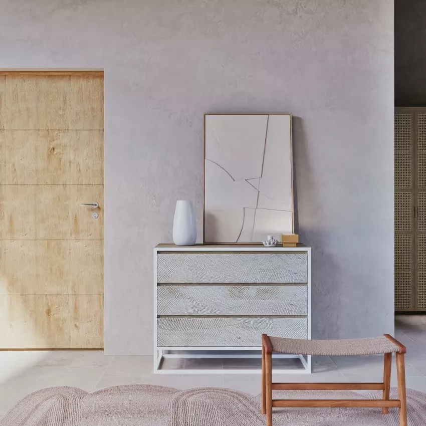 Façades des tiroirs : manguier massif sculpté à la main, peinture nitrocellulosique coloris blanc