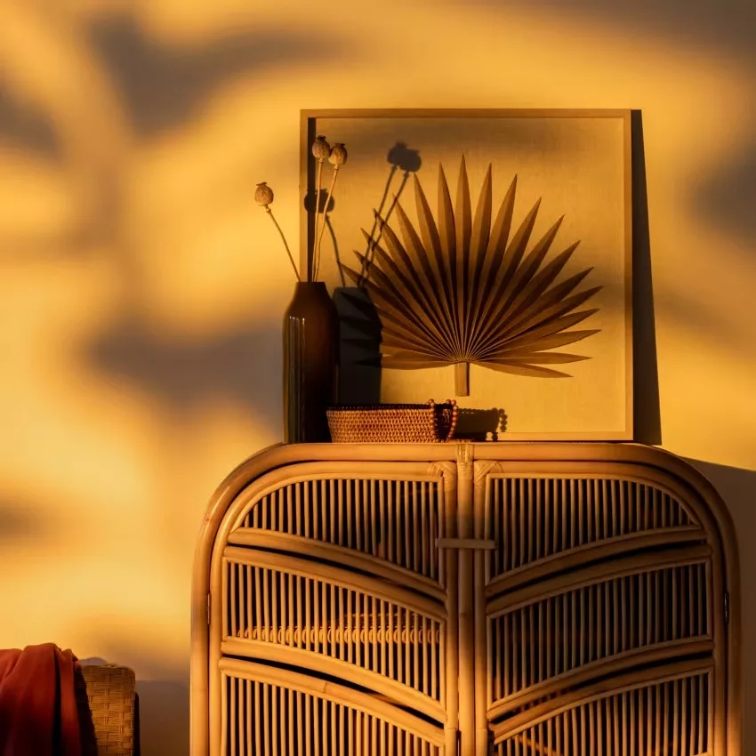 Poignées et piètement : rotin finition vernis acrylique transparent
