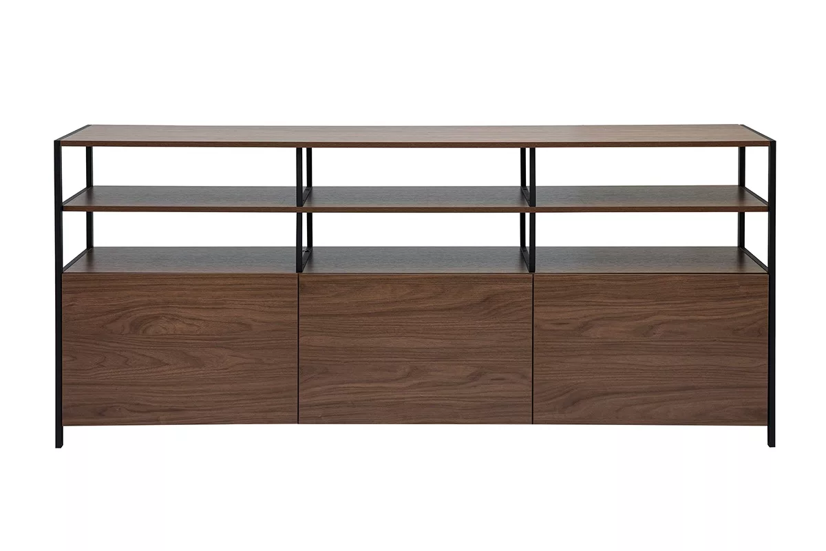 La structure en métal noir, fine mais robuste, encadre parfaitement les portes et étagères tout en renforçant la stabilité générale du meuble. Ce contraste de matériaux crée ainsi une ambiance authentique inspirée du style industriel revisité. Polyvalent, ce buffet contemporain s’intègre donc dans divers univers : en meuble TV dans le salon, en buffet dans la salle à manger, ou encore comme meuble de présentation dans un grand couloir.