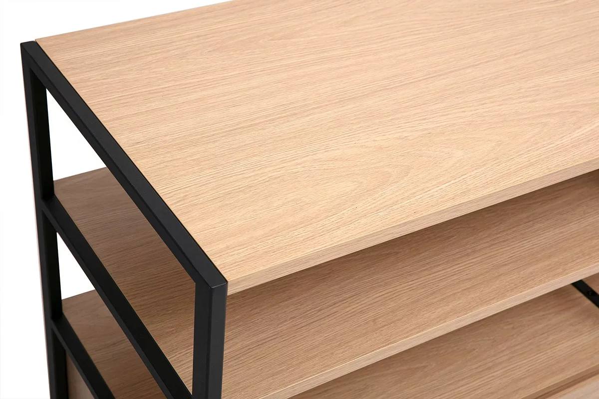 Ce buffet industriel se distingue alors par sa conception hybride mêlant chaleur de la finition bois et éclat du métal. Son plateau long de 180 cm et ses étagères ouvertes offrent une grande surface d’exposition idéale pour vos objets décoratifs, plantes, livres ou matériel multimédia. Les niches donnent ainsi un sentiment de légèreté visuelle tout en assurant une grande capacité de rangement accessible d’un simple geste. Dans la partie inférieure, MAXENCE intègre trois compartiments fermés. Cet agencement permet de dissimuler facilement vaisselle et autres accessoires de table.
