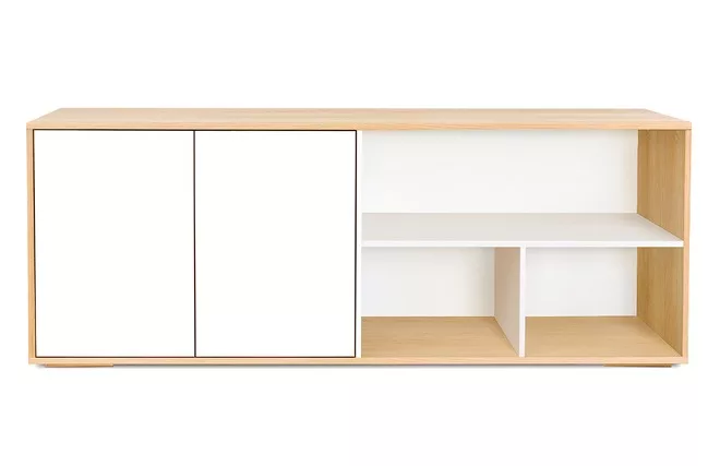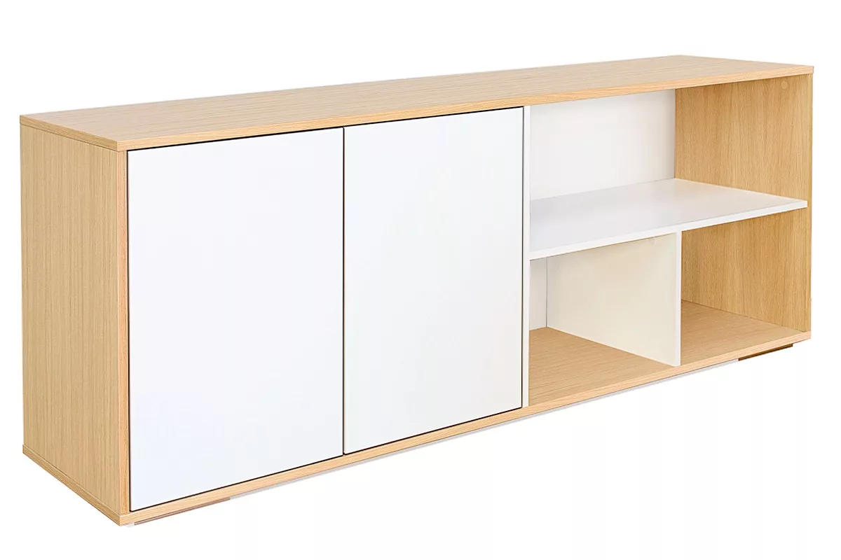 Avec sa forme géométrique marquée, ses teintes douces et naturelles, ce buffet blanc et bois partiellement ouvert a été pensé pour les intérieurs cosy et modernes. Au coeur d’un aménagement qui se veut sans excès et harmonieux, ce buffet bas caractérisé par des lignes simples, se distinguera par son minimalisme et style intemporel. À la fois sobre et chaleureux, ce meuble de rangement inspiré du design nordique trouvera aisément sa place dans de nombreux styles d’intérieurs.
