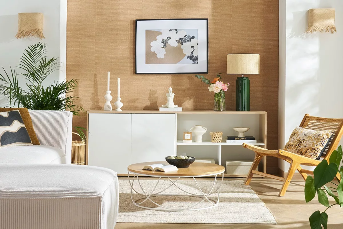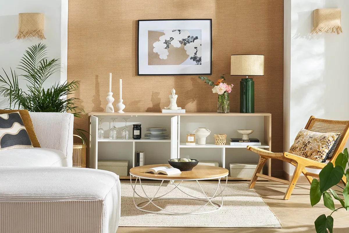 Pour un résultat 100% déco, exposez à la lumière douce et apaisante d’une lampe à poser des bougeoirs, un vase, une plante, des cadres ou miroirs.
