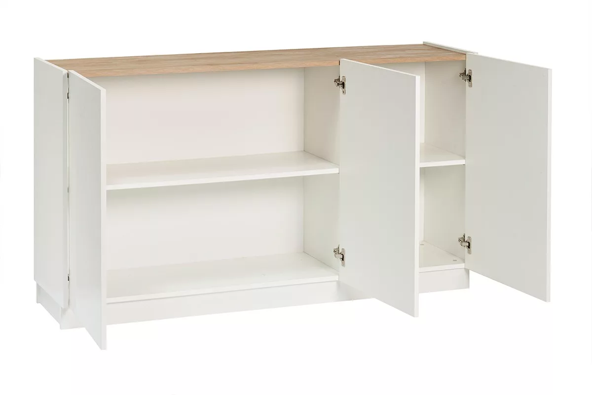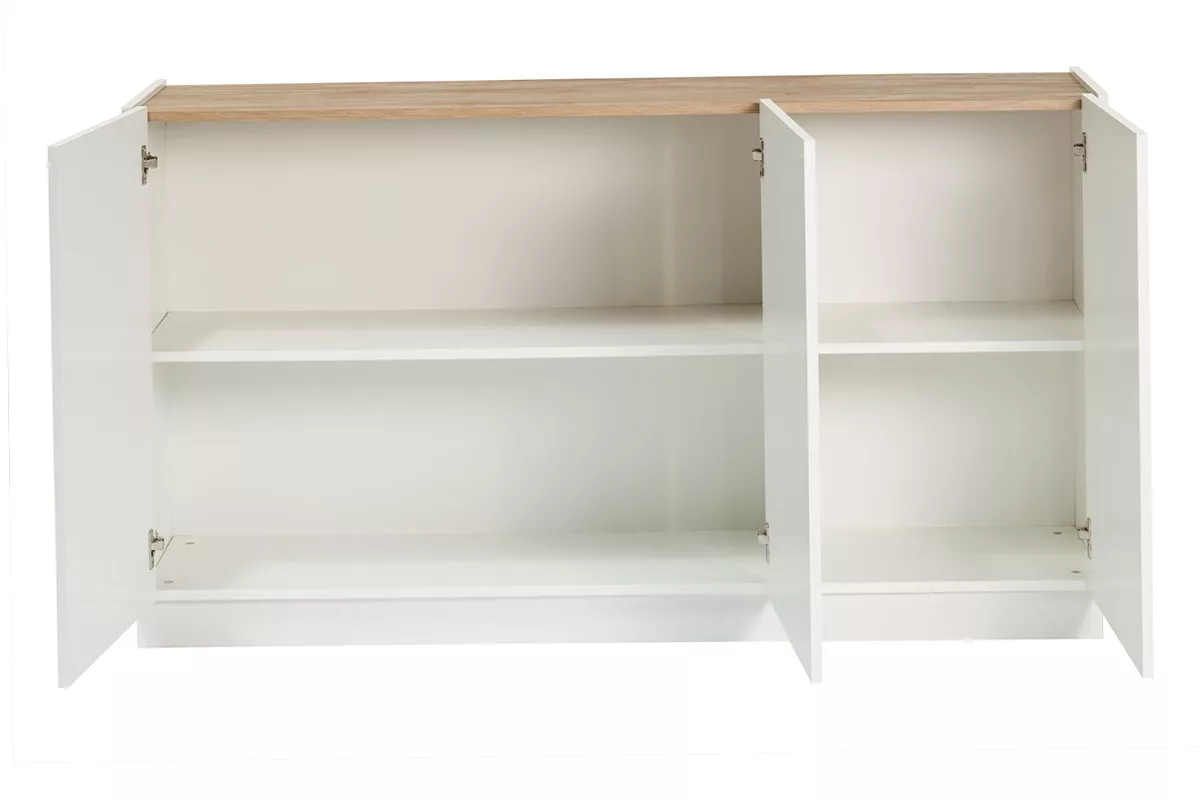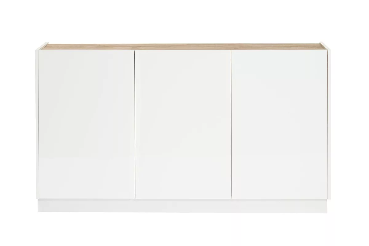 Buffet design blanc laqué brillant et bois clair 3 portes L155 cm NELIO