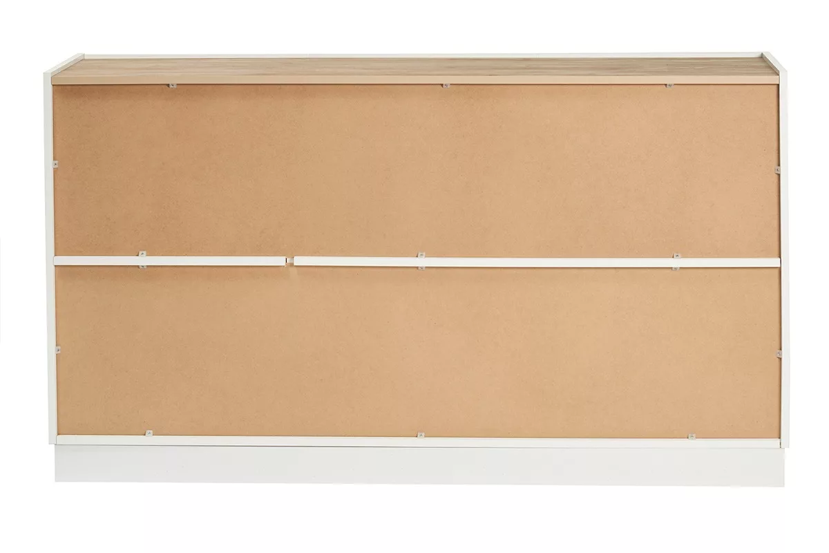 Si le plateau finition bois clair (panneaux de fibres de bois mélaminé finition chêne clair) charme par ses jolies nuances et son caractère authentique, la structure blanche finition laquée offre une belle note de modernité à l’ensemble. Grâce à ce buffet design blanc et bois sans pied ajoutez une touche tendance et non moins chaleureuse à l’ambiance de votre pièce de vie ! Idéal pour habiller l’espace et offrir une pièce de vie organisée, ce buffet bas design (dimensions L155 x P40 x H86.5 cm) – qui mêle codes scandinaves et contemporains – sera à l’aise dans de nombreux styles d’intérieur.