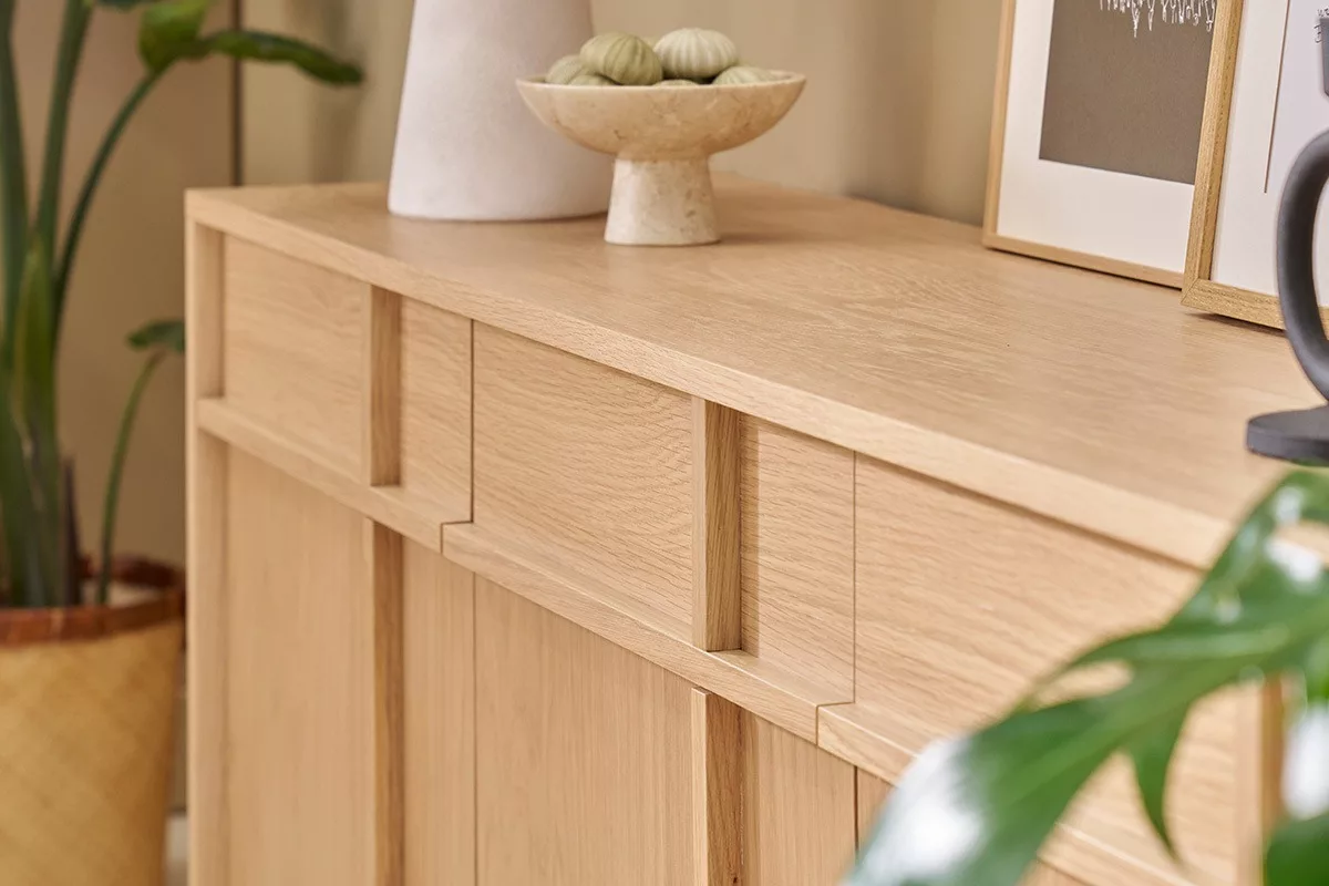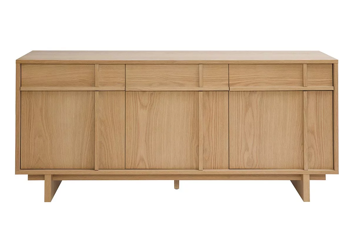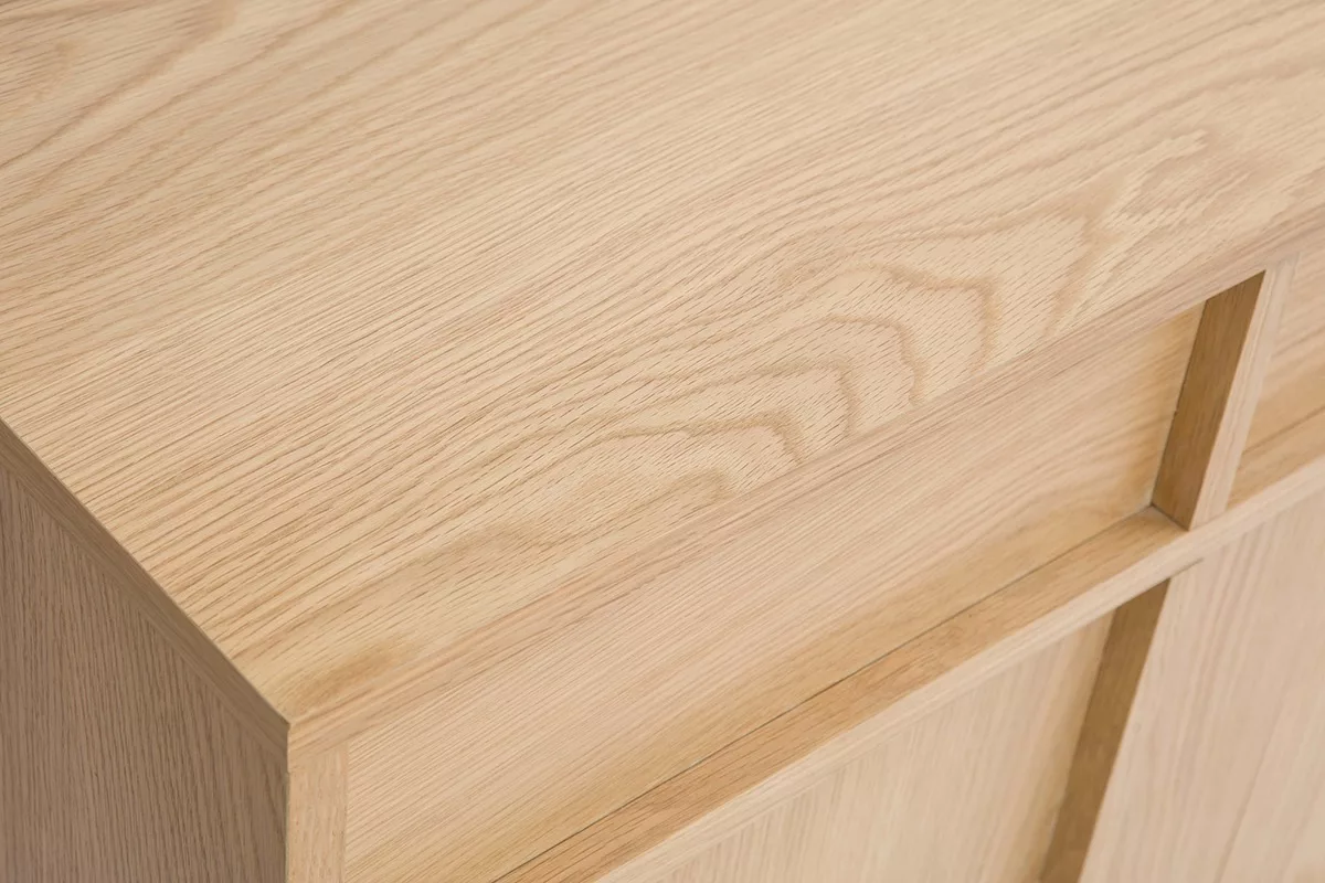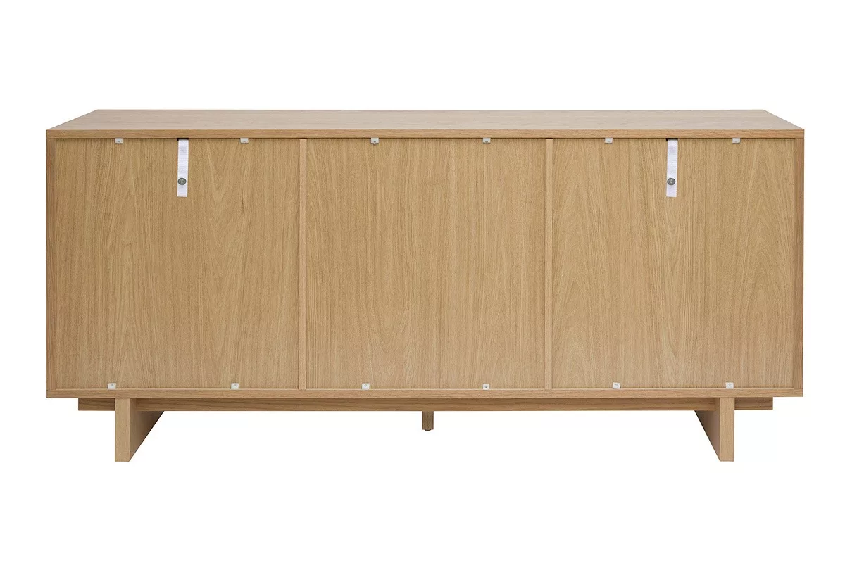 Conçu avec un placage en chêne naturel, ce buffet allie robustesse et longévité. Son bois clair, à la fois intemporel et moderne, s’harmonise parfaitement avec tous les styles de décoration, du bohème au contemporain en passant par le vintage. En plus de ses pieds en panneaux de fibre de bois placage chêne, la structure repose ausi sur un pied central solide en chêne massif qui assure une stabilité optimale, même lorsque le meuble est entièrement chargé, jusqu’à 80kg.