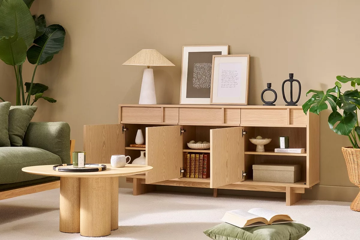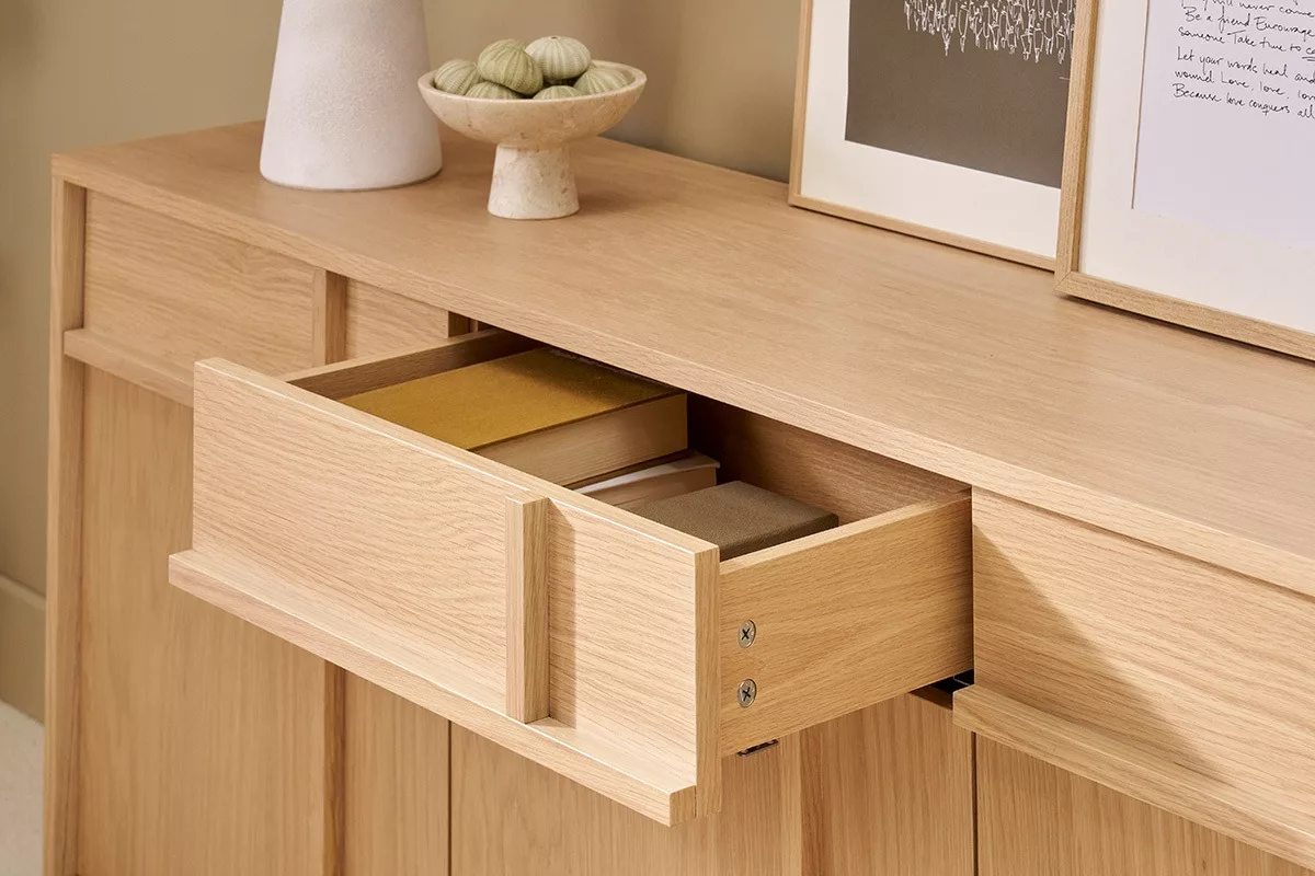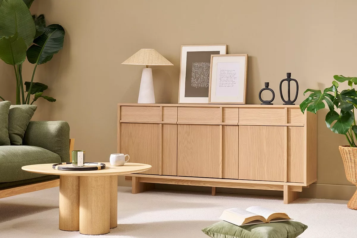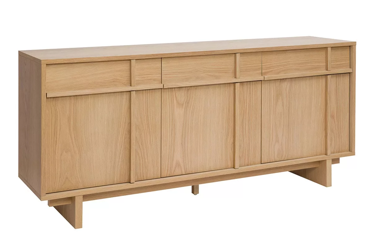 Buffet bas en bois clair livré prêt à monter.