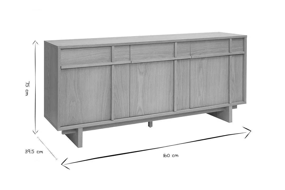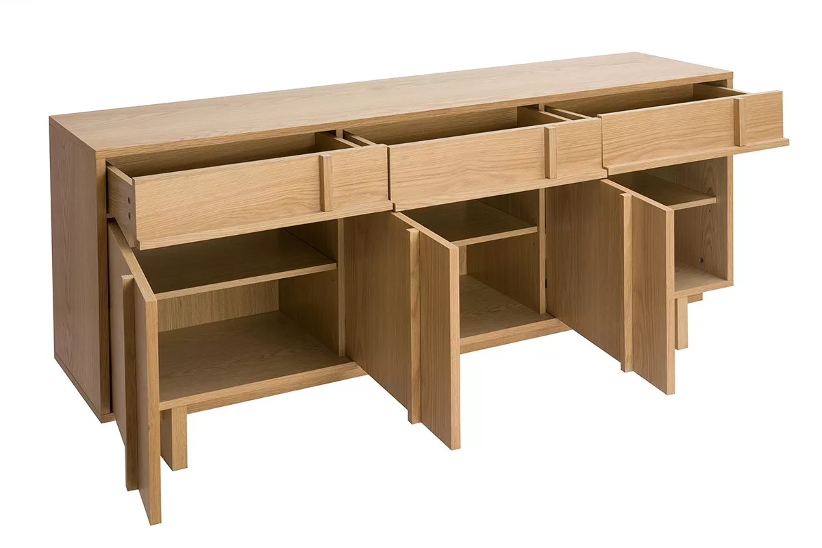 Avec trois tiroirs spacieux et trois portes battantes, le buffet long ZAO offre un espace de rangement généreux et bien organisé. À l’intérieur, vous trouverez des étagères adaptées pour stocker votre vaisselle, vos livres, votre linge de maison ou d’autres objets du quotidien. Son organisation bien pensée permet de garder un intérieur soigné et ordonné, tout en ayant tout à portée de main.