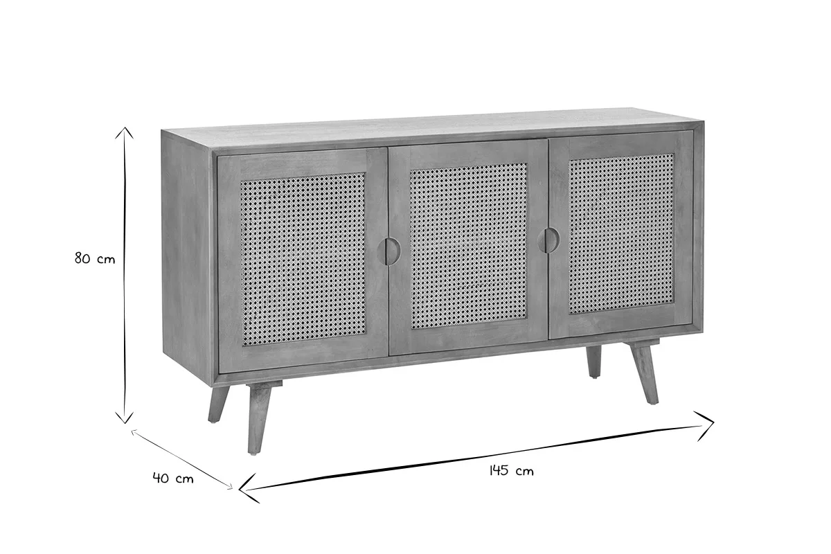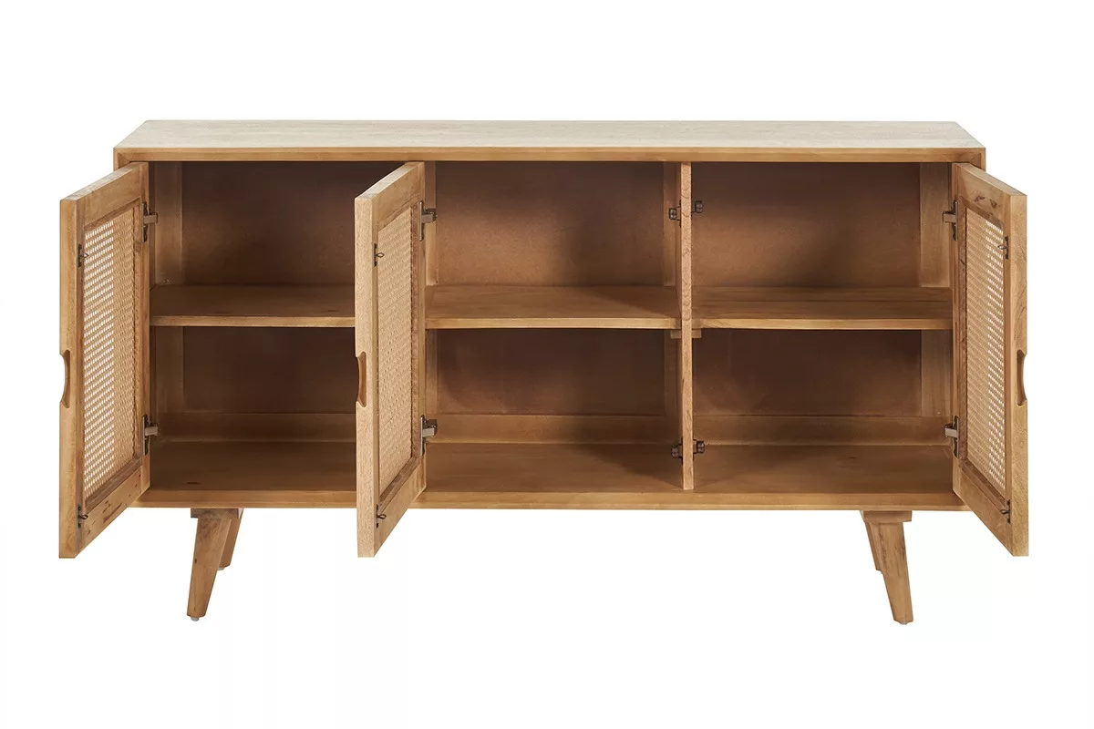 Sous des lignes minimalistes, travaillées dans les moindres détails, ce grand buffet en bois et cannage (dimensions L145 x P40 x H80 cm) offre de beaux volumes de rangement. Indispensables pour un intérieur toujours bien apprêté, découvrez sous les trois portes battantes, pas moins de six larges niches (dimensions intérieures L46.5 x P32 x H27 cm). Linge de maison, vaisselles, documents, accessoires numériques, livres ou documents… Faites place nette et gardez votre espace de vie bien ordonné grâce à ce meuble de rangement en bois et cannage. Robuste et prêt à accompagner votre quotidien pour longtemps, ce buffet long en enfilade est soutenu par un solide piètement en manguier massif.