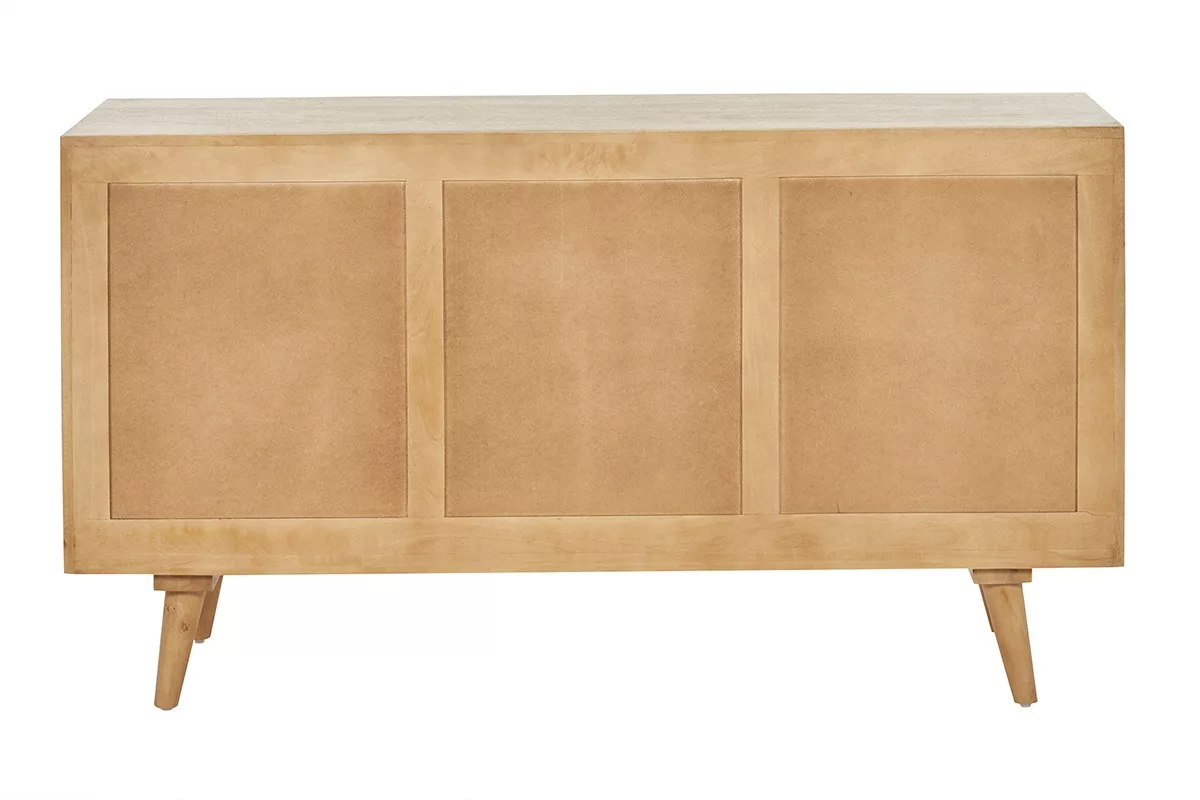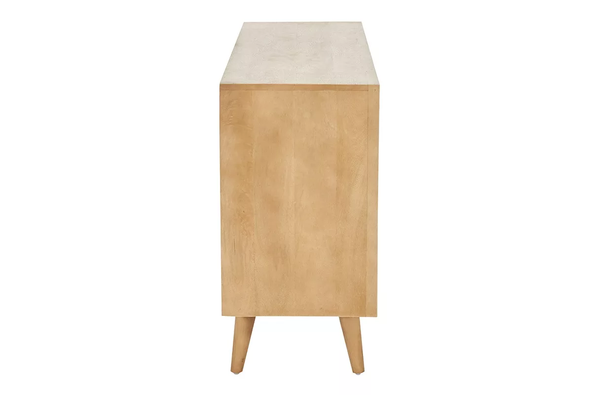 Original, ce buffet design en bois se démarque par son style inédit et sa personnalité bien affirmée. Bois blond lumineux de la structure en manguier massif et jeux d’entrelacs en rotin sur les façades de portes, forment un duo à la fois doux et empreint de caractère.