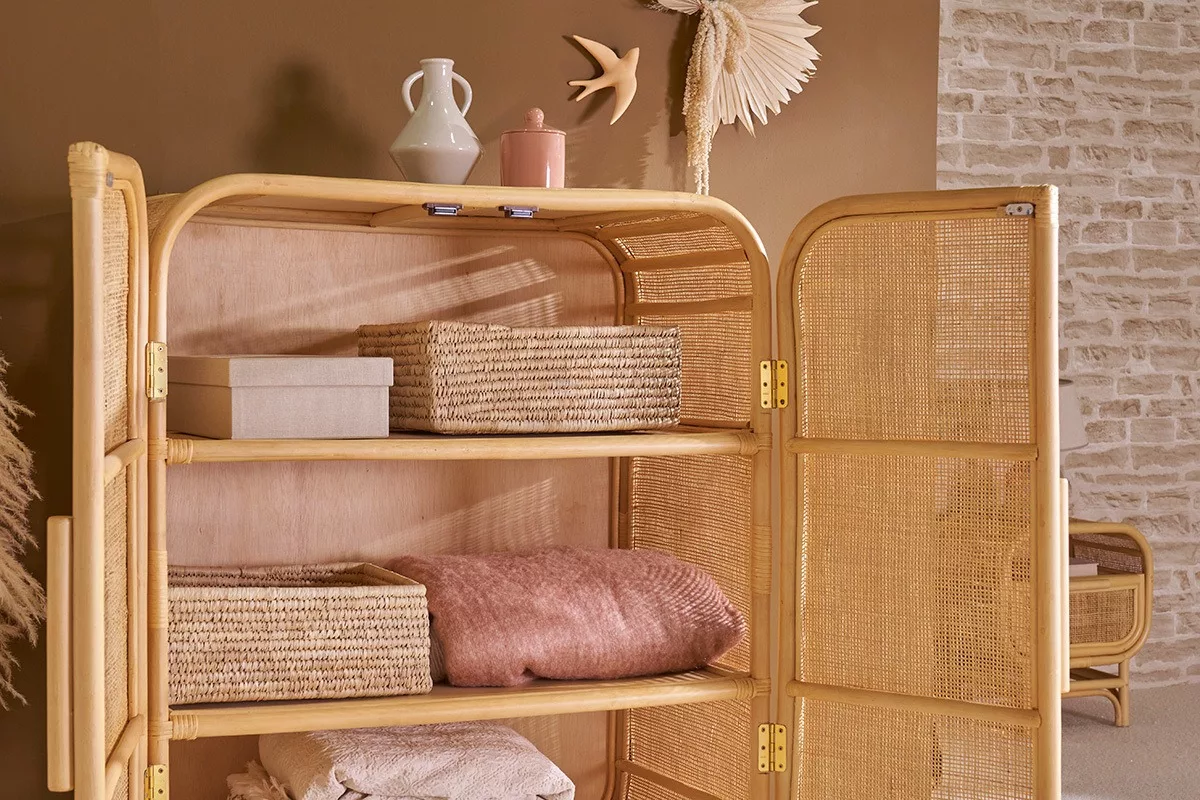 La collection LUWAK a été pensée pour apporter de la douceur à l’espace, grâce ses formes fluides et sa matière naturelle. J’ai cherché à retrouver l’esprit du rotin, sa souplesse, sa chaleur, tout en lui donnant une lecture plus architecturée, où les courbes deviennent de véritables éléments structurels. Ici, le cannage dissimule sans enfermer, laissant deviner la lumière et les objets qu’il protège. – Caroline Marliac