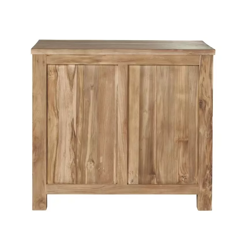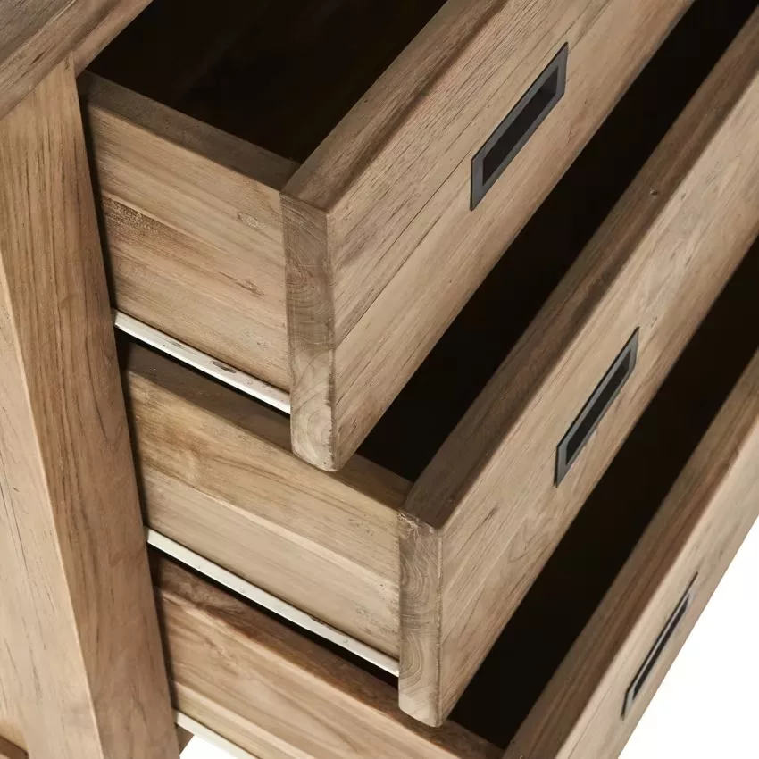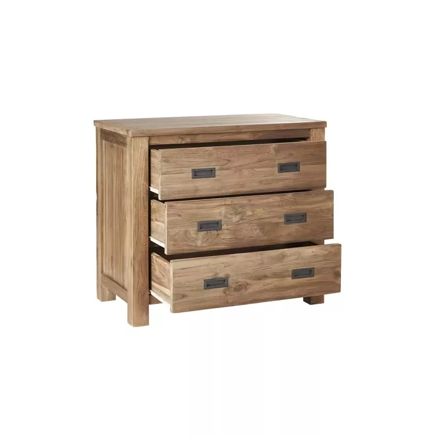Cette commode en bois de teck recyclé possède de jolies poignets en laiton donnant un look industriel à votre meuble. Caractéristiques : Matière : Teck recyclé – Couleur : naturel – Hauteur : 80 cm – Longueur : 90 cm – Profondeur : 50 cm – Poids : 53kg – Garantie : 5 ans – Montage : Livré monté. Les + : 3 tiroirs – Teck recyclé – Poignées en laiton.