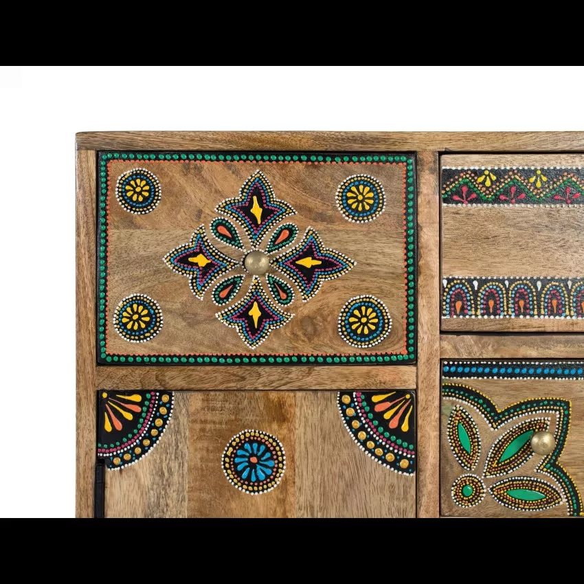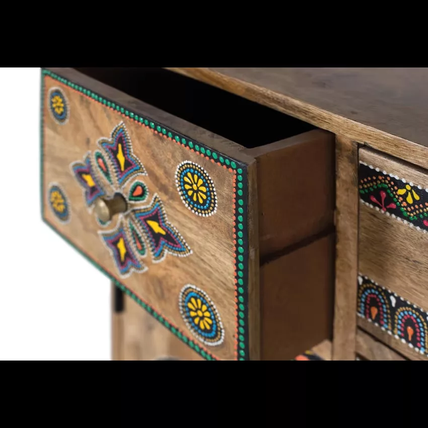 Meubles d’appoint en bois massif et MDF. Il possède deux portes et 5 tiroirs offrant un grand espace de rangement. Tous les détails des meubles sont peints à la main, présentant un design artistique et unique qui reflète un savoir-faire soigné. Les détails peints à la main comprennent divers motifs qui apportent une touche distinctive et décorative, faisant de ce meuble non seulement une pièce fonctionnelle, mais aussi un élément décoratif qui embellit n’importe quel espace. – Mesure des façades des tiroirs : 15×23, 13×33 et 11x13cm – Mesure intérieure des tiroirs : 13x20x26, 10x31x26 et 9x11x26cm. – Mesures de la porte : 36×23 et 24x18cm. – Hauteur des jambes : 12 cm. Étant donné qu’il s’agit d’un meuble en bois naturel et fabriqué à la main, il peut conserver ses nœuds et ses veines d’origine et peut donc présenter des différences en ce qui concerne la couleur.