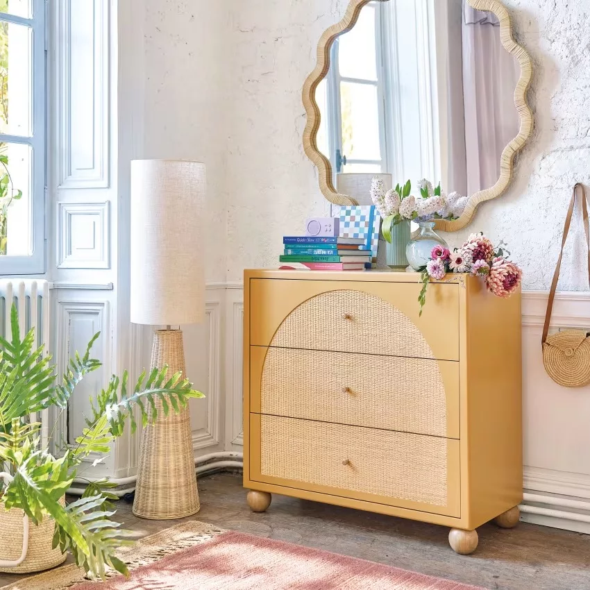 Inspirez-vous du style dedans-dehors avec cette commode haute 3 tiroirs ocre et rotin tressé DABALI !