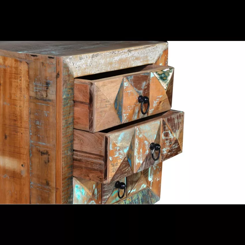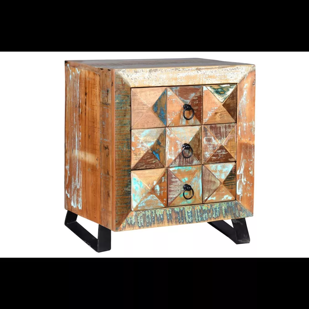 Table de chevet 3 tiroirs en bois recyclé, avec pieds en métal.
