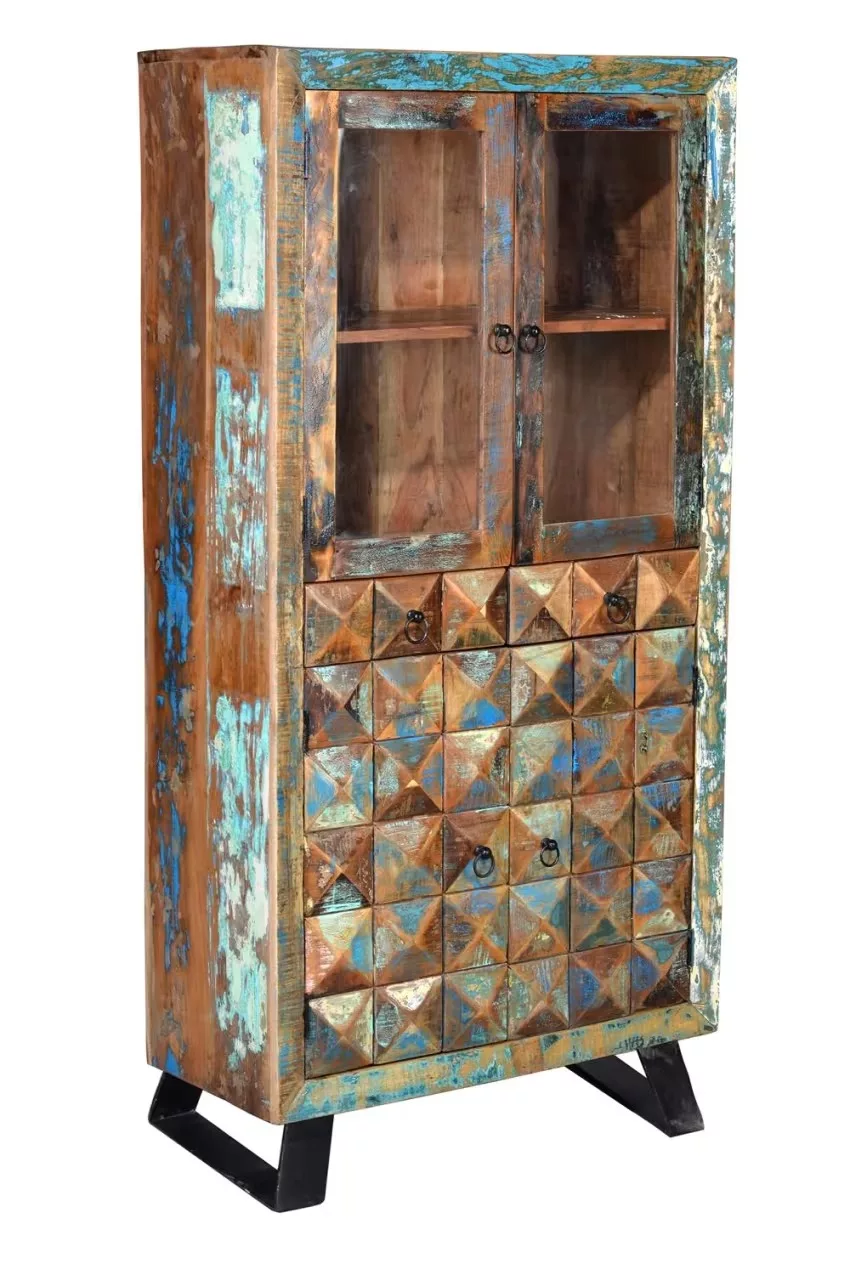 Vitrine en bois recyclé provenant de la ferraille de bateaux et de vieux meubles. Travaillé dans la conception de pointe de diamant. Finition satinée pour rehausser son aspect antique. Il a 4 portes avec étagères internes et 2 tiroirs. Pieds en métal de 31 cm de haut. Dimensions : 180 cm de haut X 90 cm de large X 40 cm de profondeur. Volume : 0,65m3. Poids 84 kg. Étant donné qu’il s’agit d’un meuble en bois naturel et fabriqué à la main, il peut conserver ses nœuds et ses veines d’origine et peut donc présenter des différences en ce qui concerne la couleur.