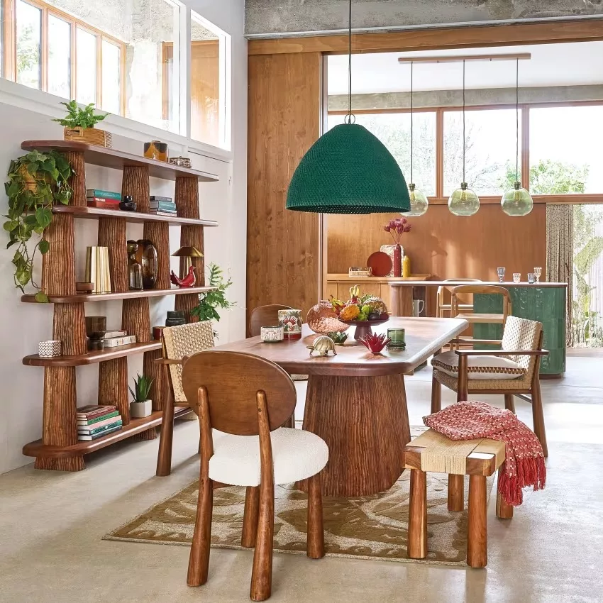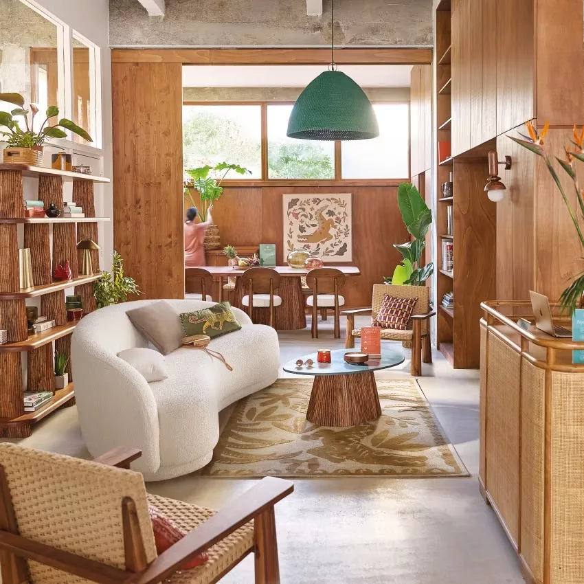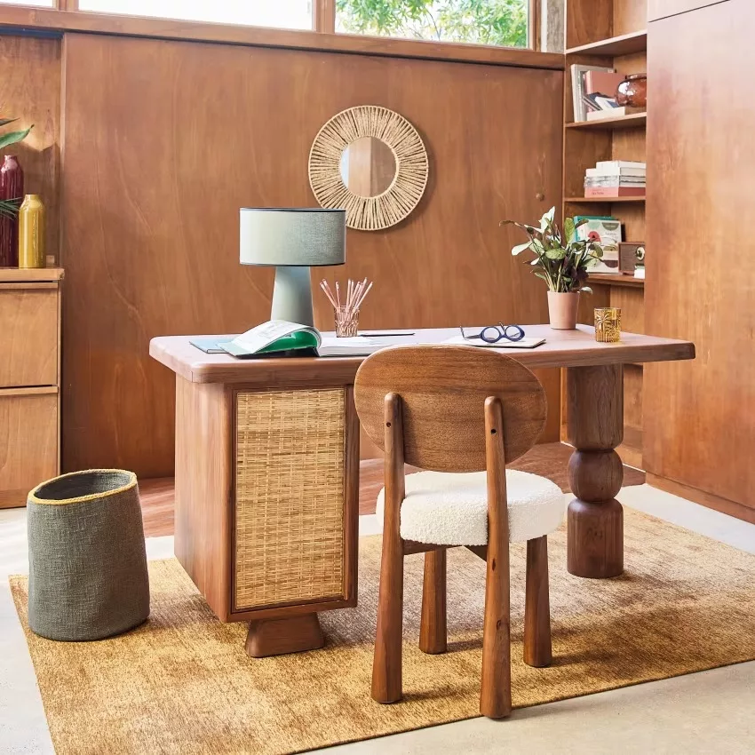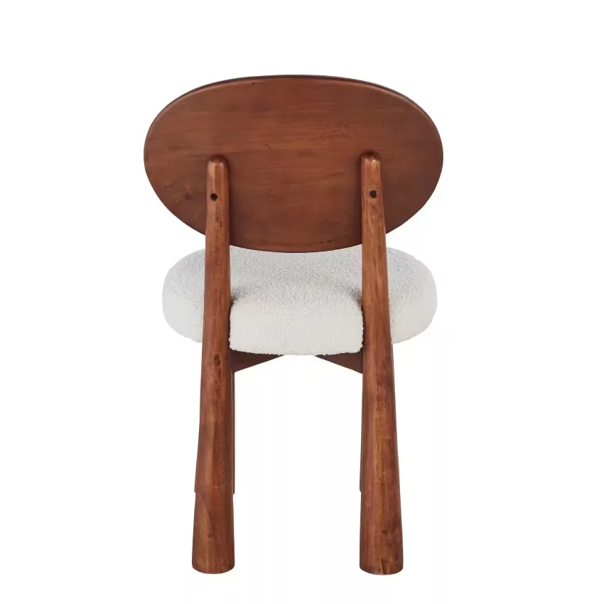 Le bois d’hévéa effet noyer et l’assise en bouclettes écrues offrent un joli contraste.