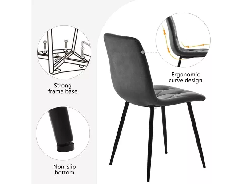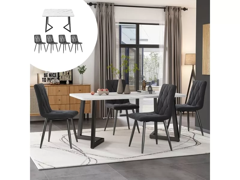 Ensemble table et chaises salle a manger, table de cuisine avec 4 chaises salle a manger en velours gris foncé, pieds de table noirs