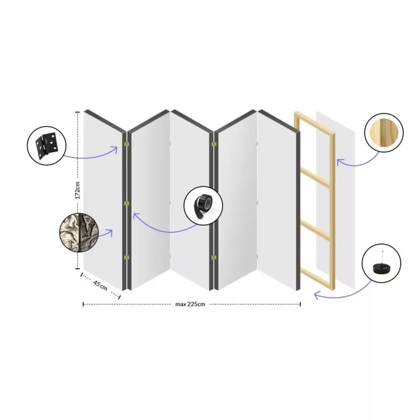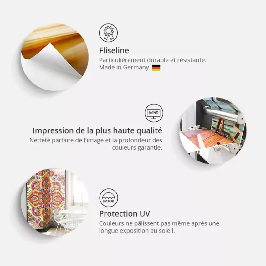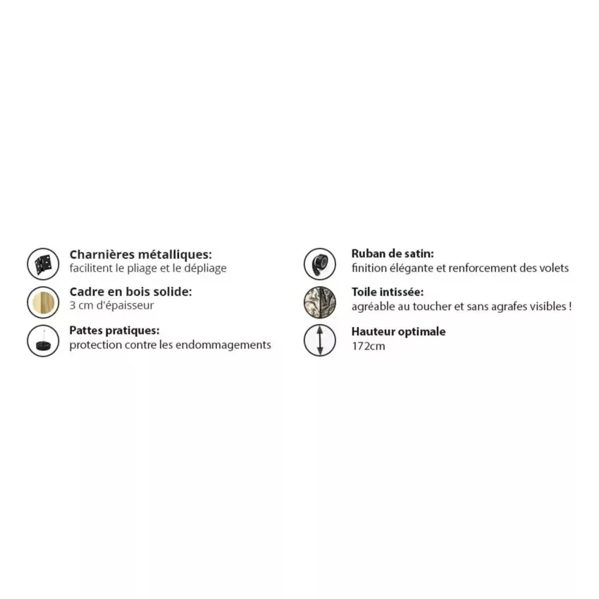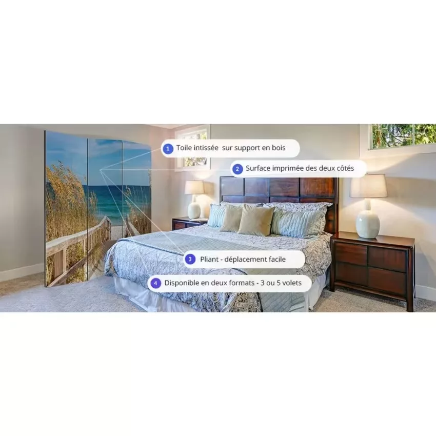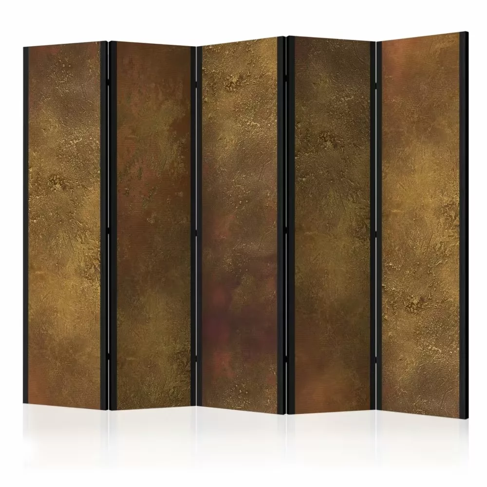 Paravent tentation dorée II – Recollection Optez pour un paravent de qualité pour décorer ou séparer différents espaces au sein d’une même pièce. Ses cinq panneaux imprimés sur toile intissée jouent sur les textures et les matières pour un rendu unique. Son cadre en bois et ses charnières métalliques en font un objet déco solide et durable. Le petit plus de ce paravent fabriqué en Europe ? Ses finitions impeccables ! Des rubans de satin jusqu’aux pattes de protection, tout est étudié dans les moindres détails. Et comme rien n’est laissé au hasard, ses impressions, présentes de chaque côté, résistent aux rayons UV sans jamais perdre de leur éclat. Un paravent décoratif et utile Besoin d’un peu d’intimité au milieu d’une grande pièce, de cloisonner une surface importante ou de se protéger élégamment des rayons du soleil ? Ce paravent décoratif aux cinq volets robustes se plie à vos besoins. C’est un accessoire déco qui a toute sa place dans votre intérieur, cumulant originalité, style et praticité d’usage. Facilement repliable, il se range et se déplace en un rien de temps. Séparateur élégant, il est aussi bien allié des petits studios que des immenses lofts, des cabinets médicaux que des salons de beauté, voire des bureaux partagés. Bref, de toutes ces pièces qui ont besoin de clarifier les espaces et délimiter les zones. Il mise sur des tonalités brunes, mariant parfaitement le noir et les reflets puissants du bronze, pour s’insérer facilement dans votre décor ! Paravent décoratif ‘Golden Temptation II’ est un accesoire unique pour des intérieurs modernes. Paravent 5 volets, fait en bois et imprimé des deux côtés paravent permettra de séparer discrètement l’espace dans votre intérieur et y sera une décoration remarquable. Paravents introduiront une touche d’originalitée dans chaque intérieur grâce à la fabrication soignée et aux motifs originaux en qualité Full HD. Paravents décoratifs sont une idée originale pour la décoration d’intérieur. Ils entrelacent la beauté