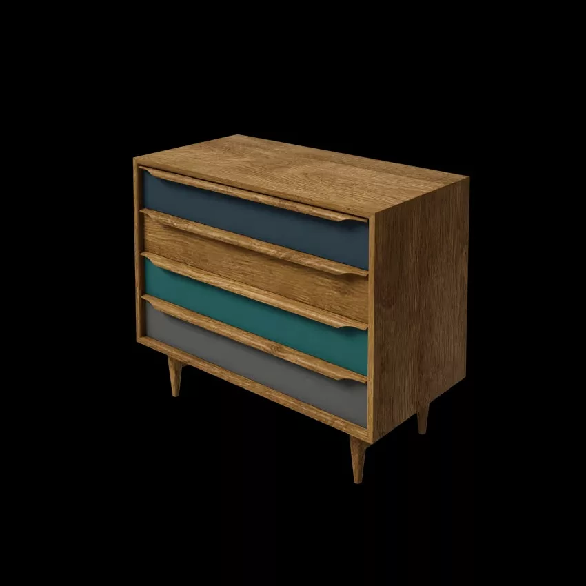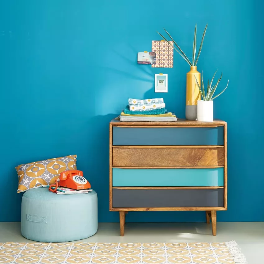 4 tiroirs peinture acrylique col. bleu, vert, gris et manguier teinté