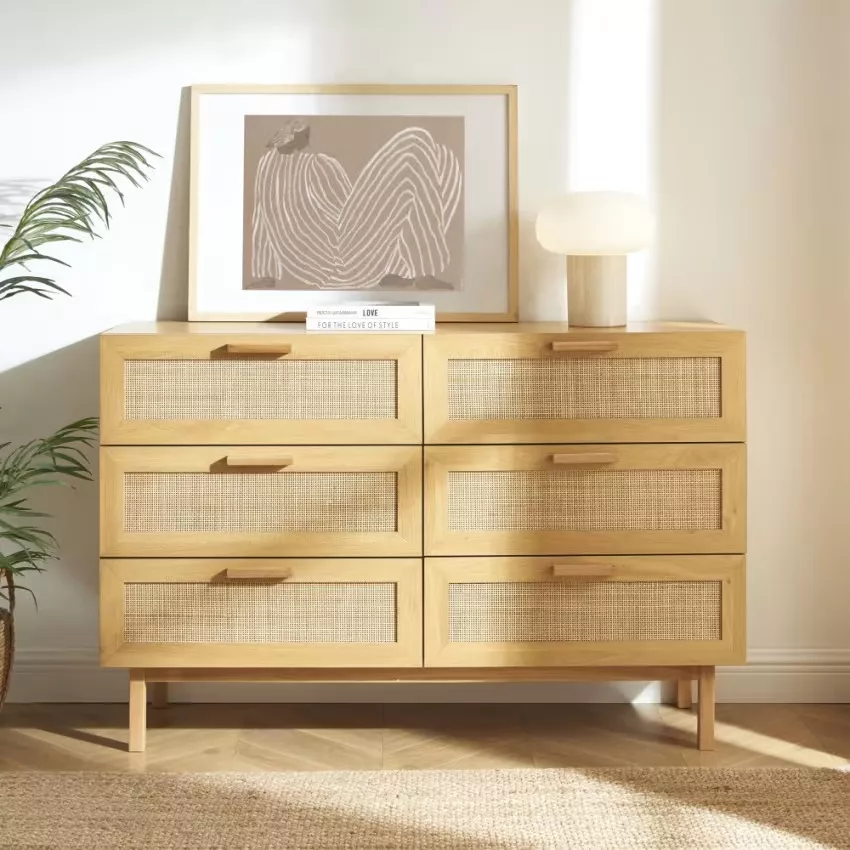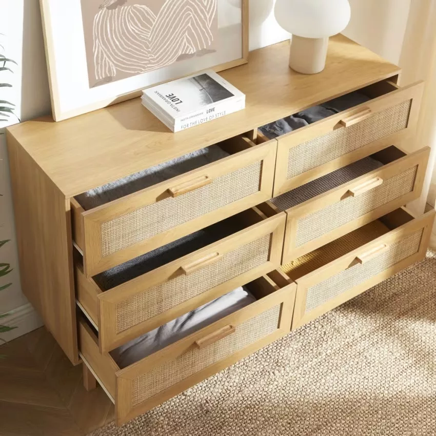 Vous êtes fan de mode et possédez un grand nombre de vêtements ? Alors voici le meuble idéal pour vous ! Là où la majorité des commodes sont dotées de 3 tiroirs, celle-ci en compte 6 : parfait pour les fashionistas ! En plus, notre commode à 6 tiroirs en bois et cannage nommée June est élégante, et aménagera votre chambre avec goût.