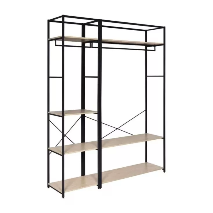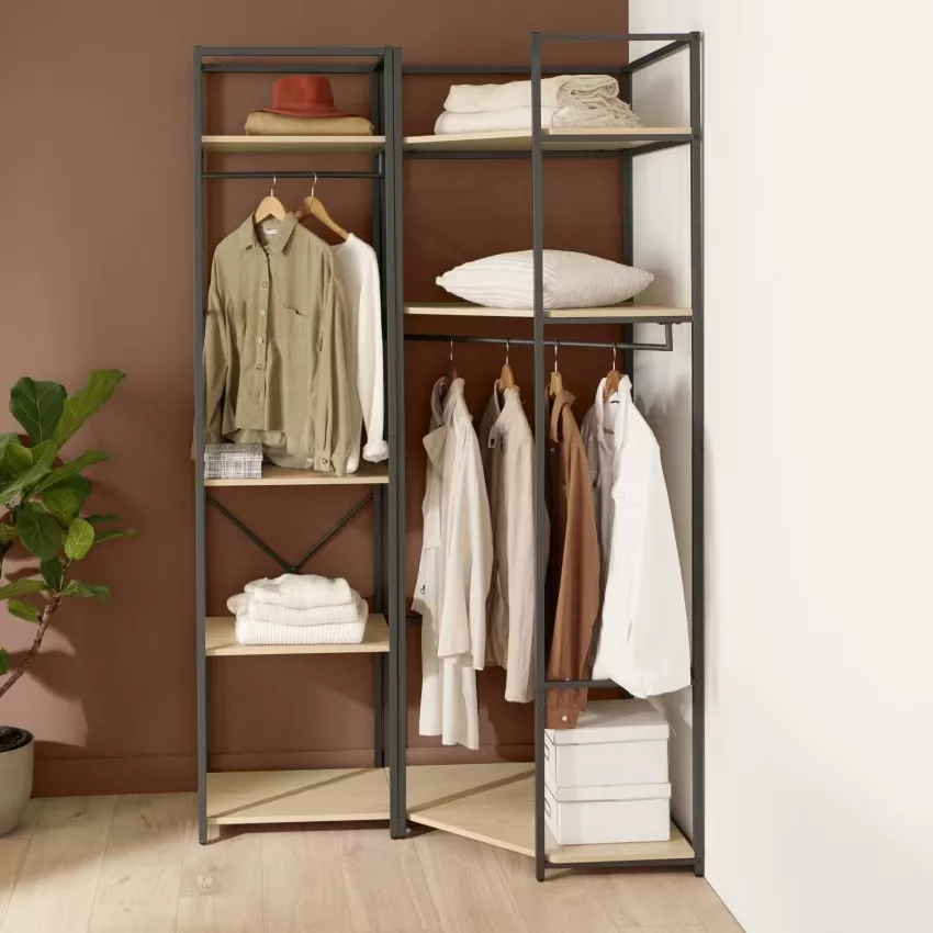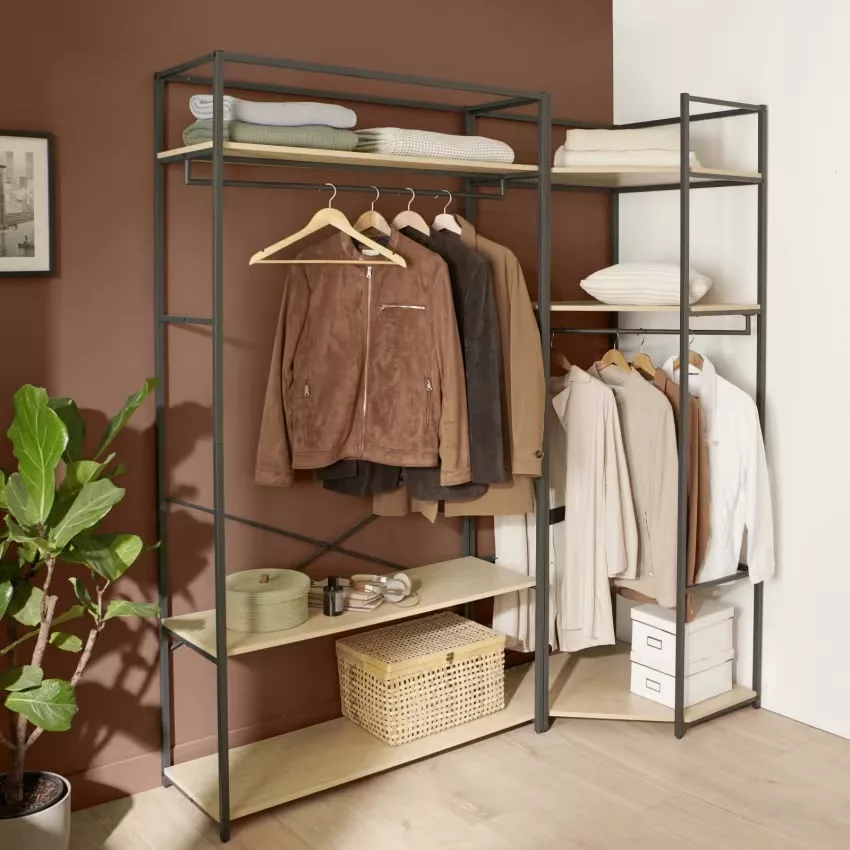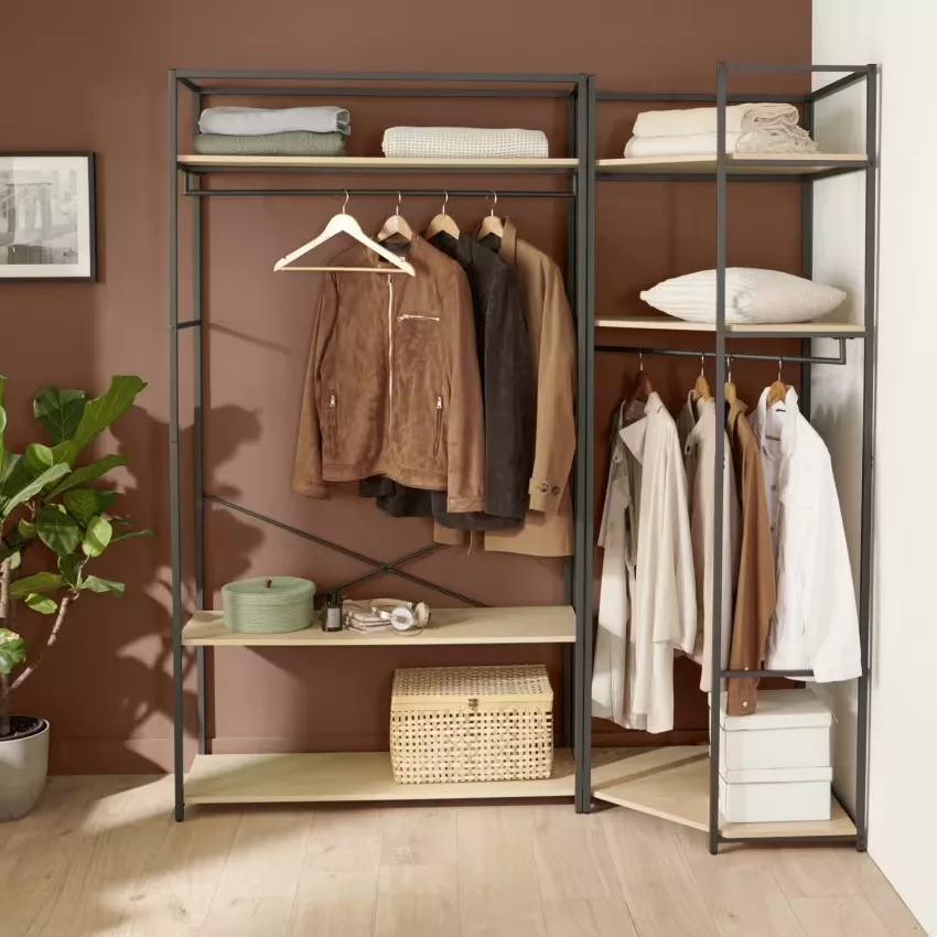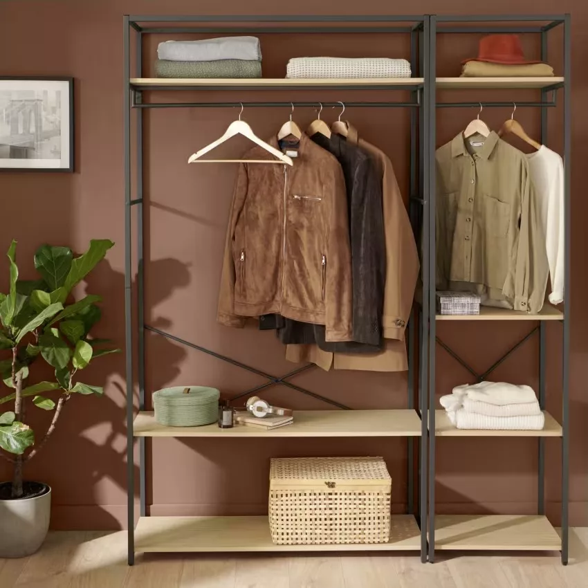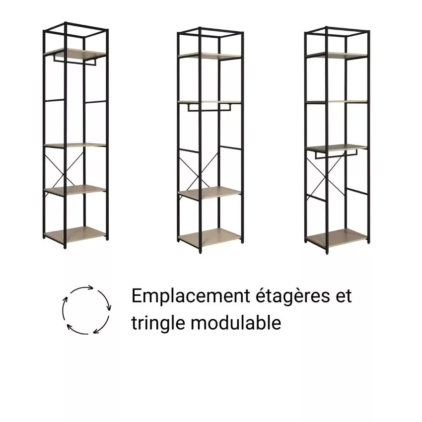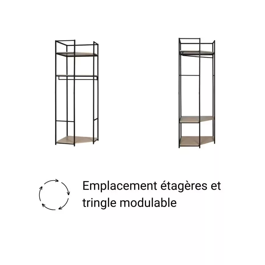 Chaque portant est doté d’une structure en acier époxy,à la fois solide et facile à entretenir, ainsi que de 3 étagères en panneaux de particules mélaminés (PPM) décor chêne naturel, parfaites pour organiser vos effets personnels. Une barre de penderie pleine largeur offre un espace généreux pour suspendre vos vêtements.