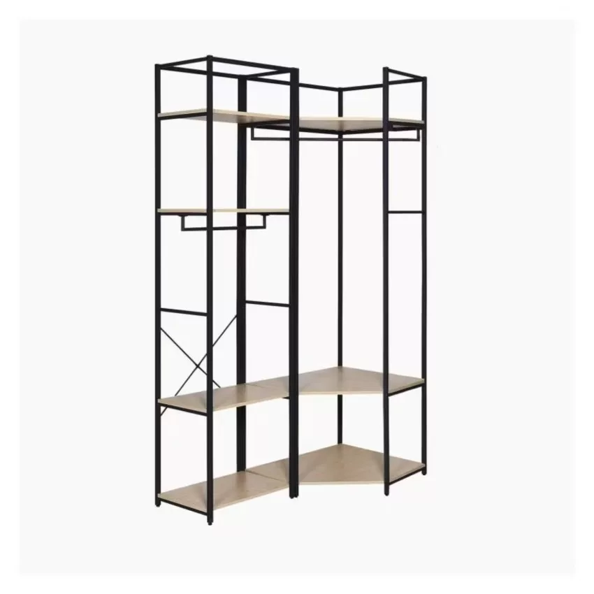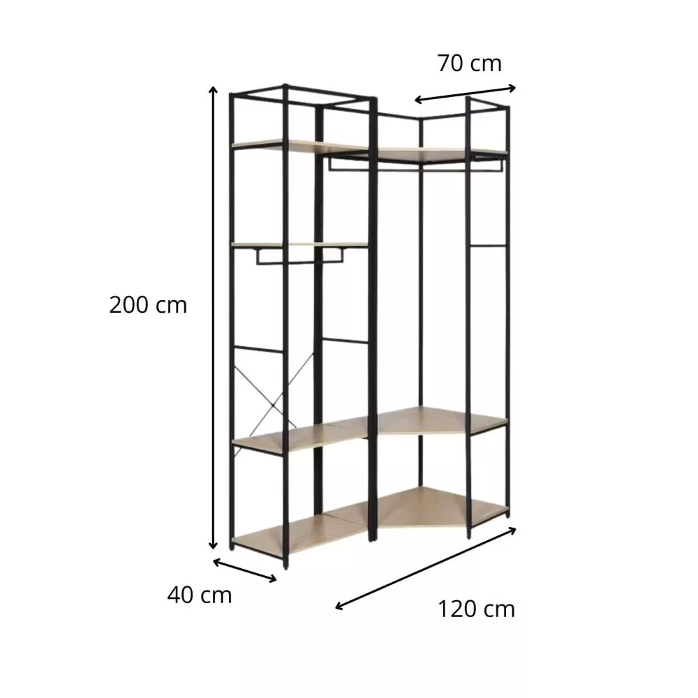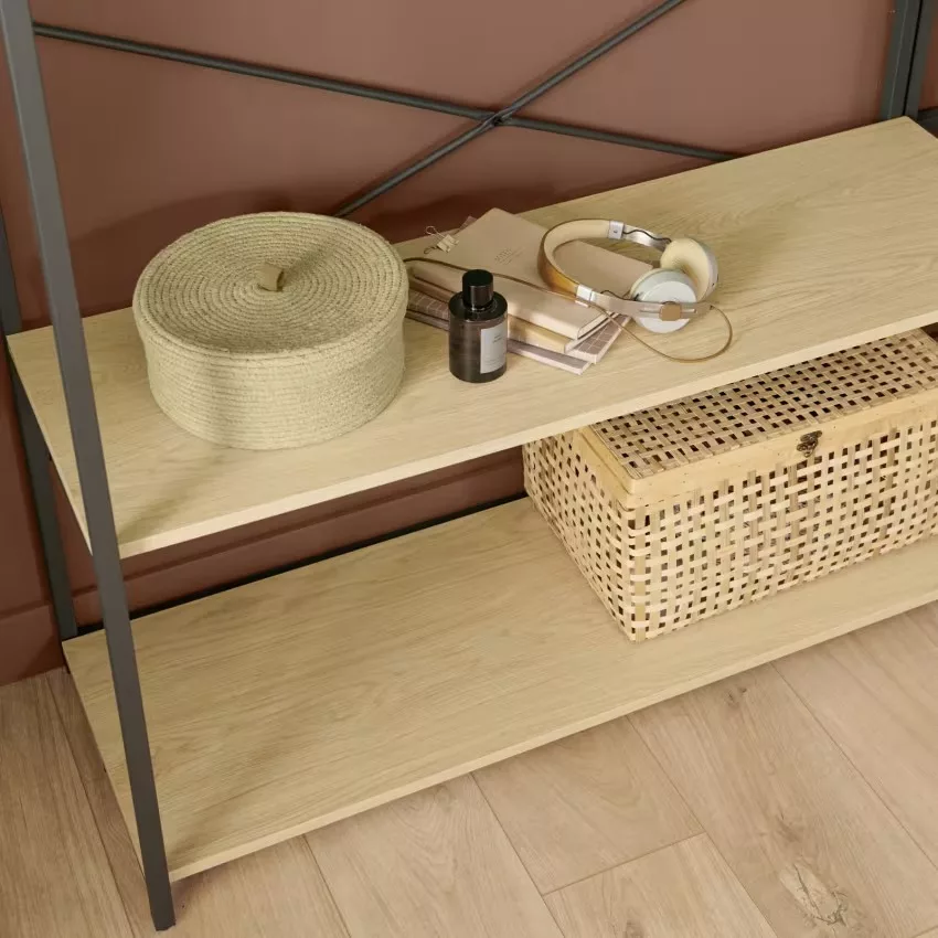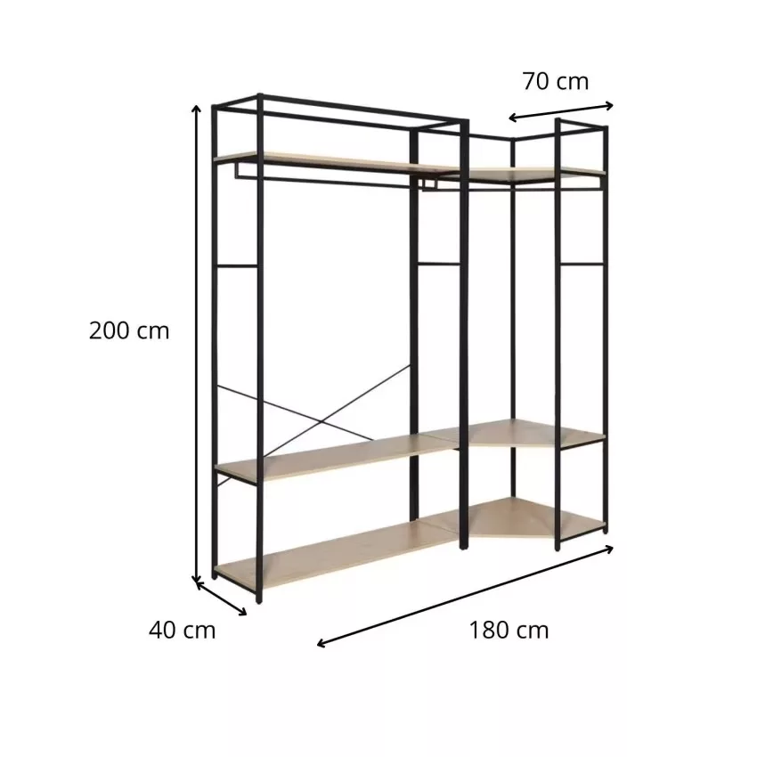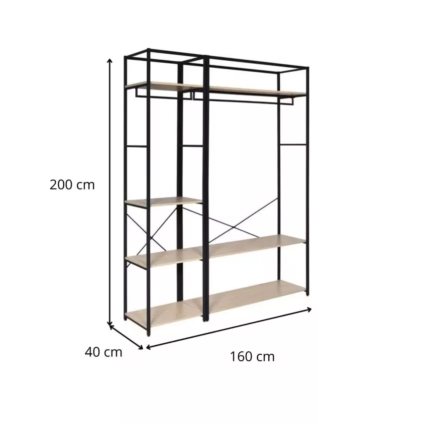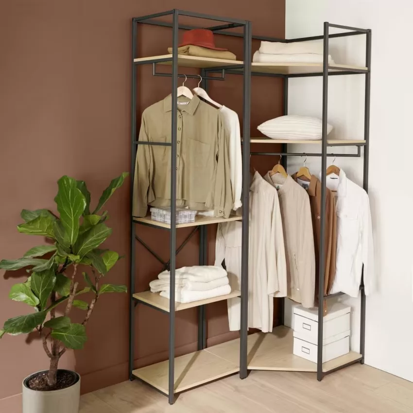 Chaque portant est doté d’une structure en acier époxy,à la fois solide et facile à entretenir, ainsi que de 3 étagères en panneaux de particules mélaminés (PPM) décor chêne naturel, parfaites pour organiser vos effets personnels. Une barre de penderie pleine largeur offre un espace généreux pour suspendre vos vêtements.