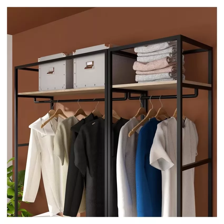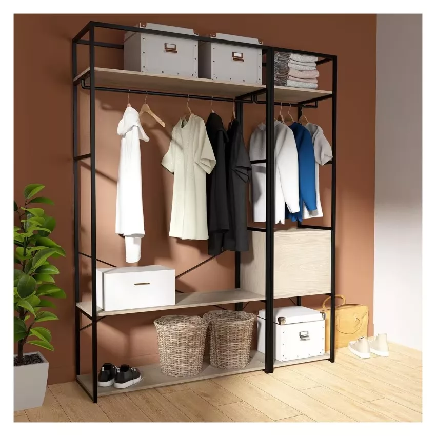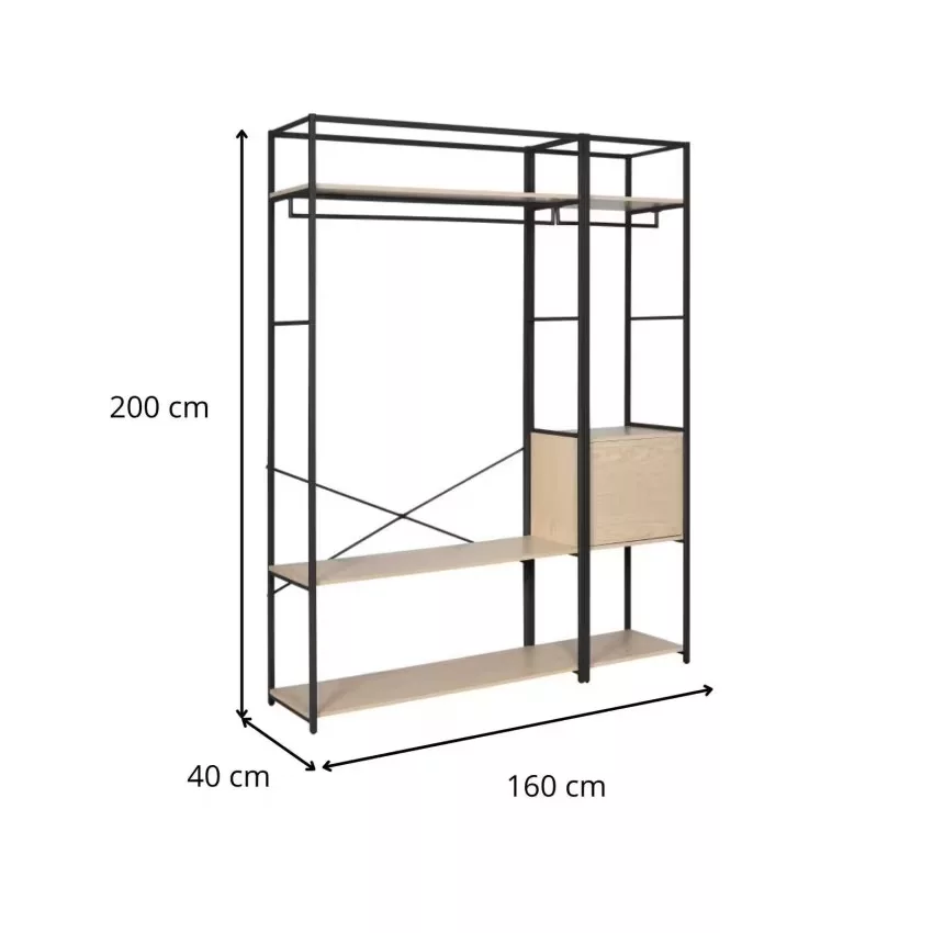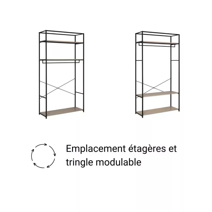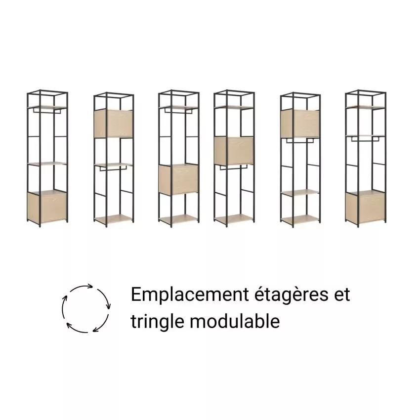 Le lot de 2 portants dressing noir et bois JUNE sera votre allié style et rangement dans une entrée, un dressing ou une chambre. Ce lot de penderies de rangement recevra vêtements, chaussures et accessoires. Equipé de 6 étagères en panneaux de particules mélaminés (Panneau de particules mélanimé) et de deux barres de penderie en acier époxy. Le petit portant est équipé d’un caisson de rangement fermé avec une porte « push système ». Cet ensemble a été imaginé pour vous faciliter le quotidien. Son design moderne et ses matériaux de qualité en font des alliés durables et robustes pour un intérieur rangé avec style.Ces portants ont été pensés pour supporter une charge maximale de 90 kg. Les portants ne sont pas prévus pour être fixés ensemble. Il est en revanche indispensable de les fixer au mur. Choisissez l’emplacement des étagères et de la barre de penderie pour composer le portant dont vous avez besoin ! Découvrez les autres éléments de la collection JUNE, modulables et combinables, pour un dressing sur mesure. Vous rêvez d’un dressing qui non seulement vous permet de ranger vos vêtements de manière ordonnée, mais qui apporte également une touche de sophistication à votre chambre à coucher ? Le dressing noir et bois est la solution idéale. Il allie le style épuré et moderne du noir avec la chaleur naturelle et authentique du bois pour un look élégant et intemporel. Conçu pour maximiser l’espace de rangement, il comprend des étagères et des penderies pour organiser tous vos vêtements. Sa petite porte battante en bois apporte une touche de raffinement tout en économisant de la place. N’attendez plus pour améliorer votre expérience de rangement avec ce dressing noir et bois élégant et fonctionnel !Dimensions : L160 x H200 x P40 cm (Petit portant : L50 x H200 x P40 cm, Grand portant : L110 x H200 x P40 cm).