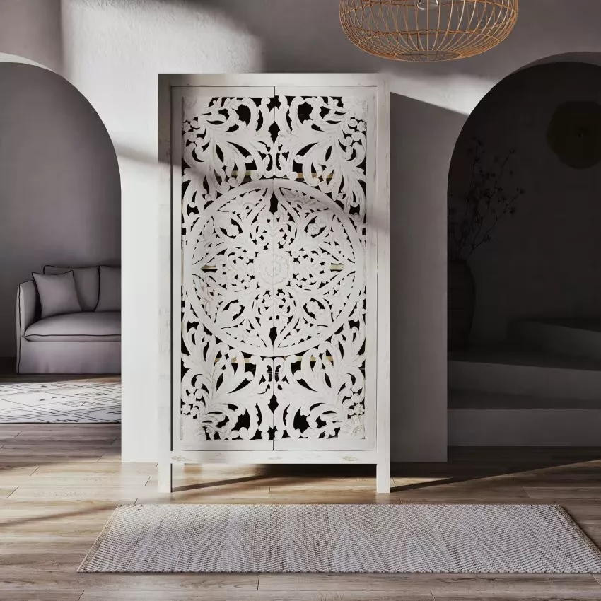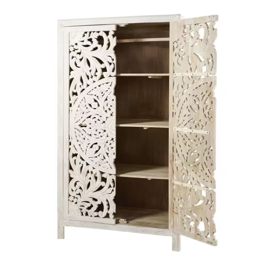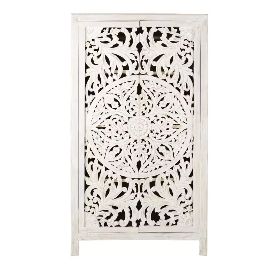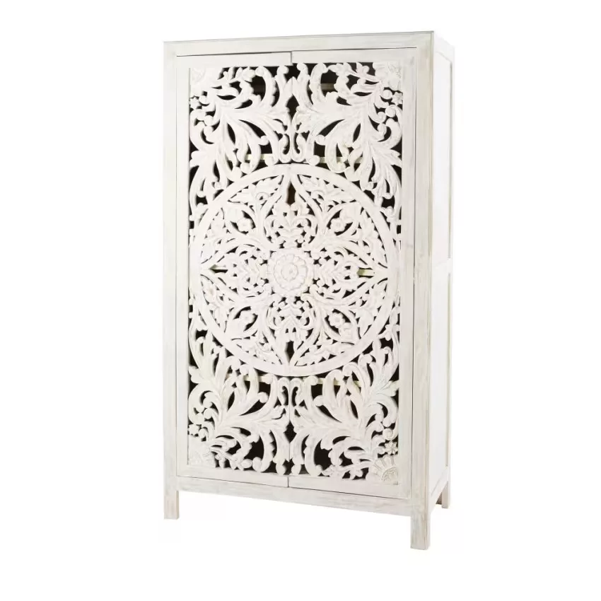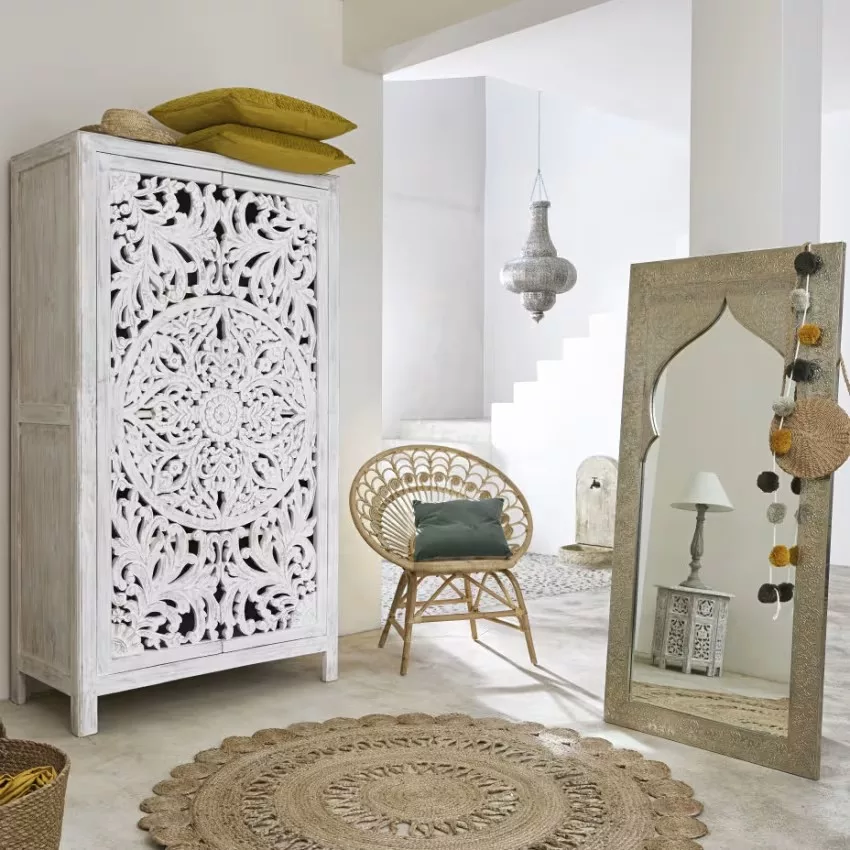 Envie de transformer votre chambre en un lieu d’évasion ? L’armoire 2 portes en manguier massif sculpté KERALA répondra à toutes vos envies. Conçu en manguier massif, ce dressing exotique présente deux portes sculptées à la main, ce qui en fait une pièce unique. Doté d’une barre de penderie et de plusieurs étagères, vos vêtements seront bien gardés. À la clé ? Une garde-robe bien rangée et une chambre sublimée !