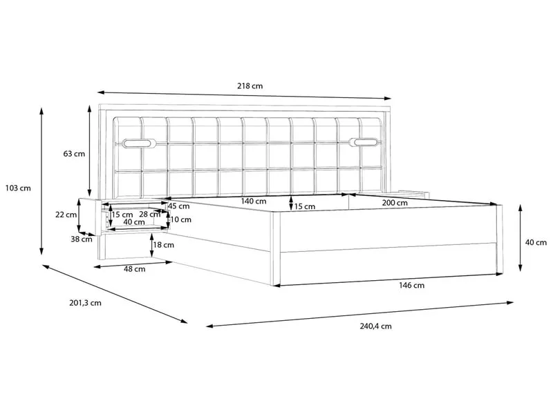 Le lit adulte PEMBURY propose des dimensions généreuses avec une largeur de 201,3 cm, une longueur de 240,4 cm et une hauteur de 103 cm, offrant un espace de couchage confortable de 140×190 cm.