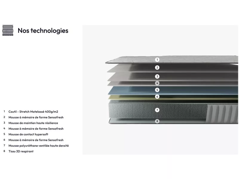 Un couchage enveloppant qui s’adapte progressivement à votre morphologie grâce à notre mémoire de forme D50kg. L’accueil doux et le soutien tonique de ce matelas seront les meilleurs alliés de nuits agréables.