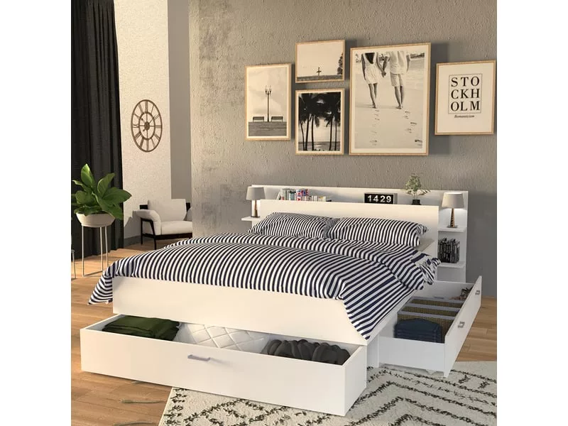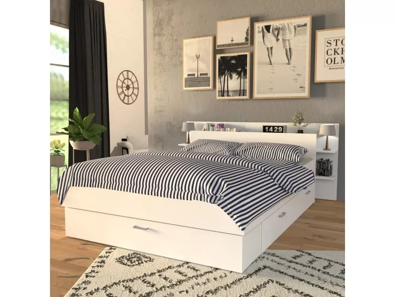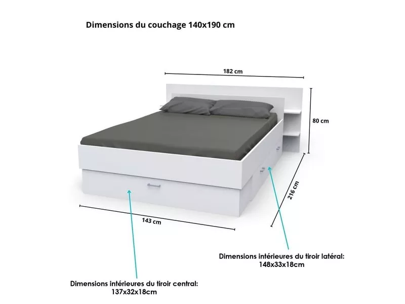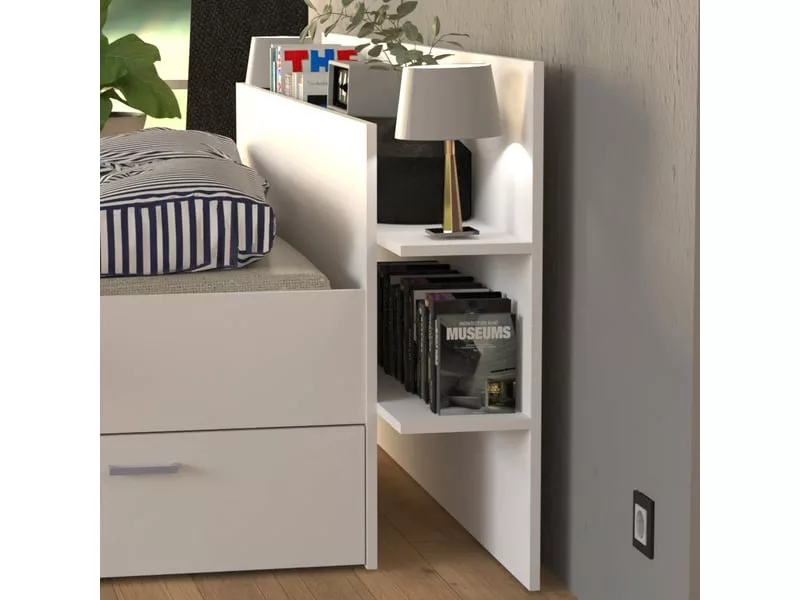 Il est équipé d’une tête de lit avec rangement, parfaite pour garder vos livres ou objets décoratifs à portée de main.