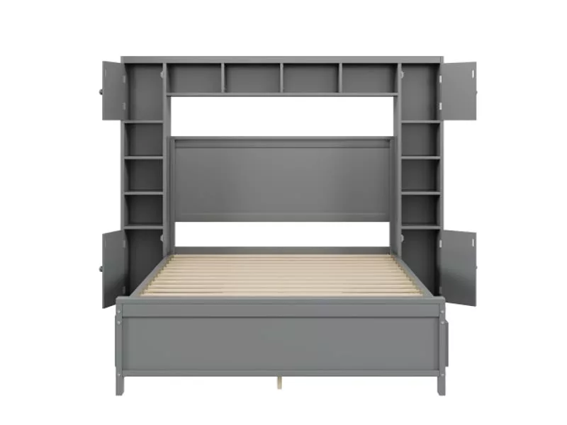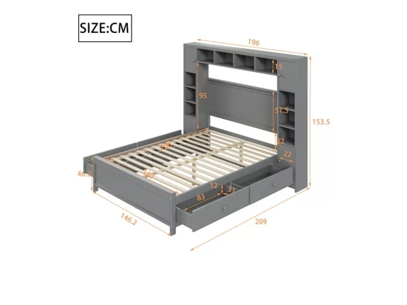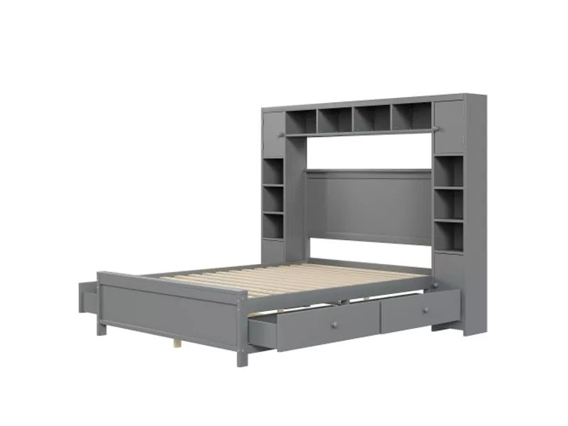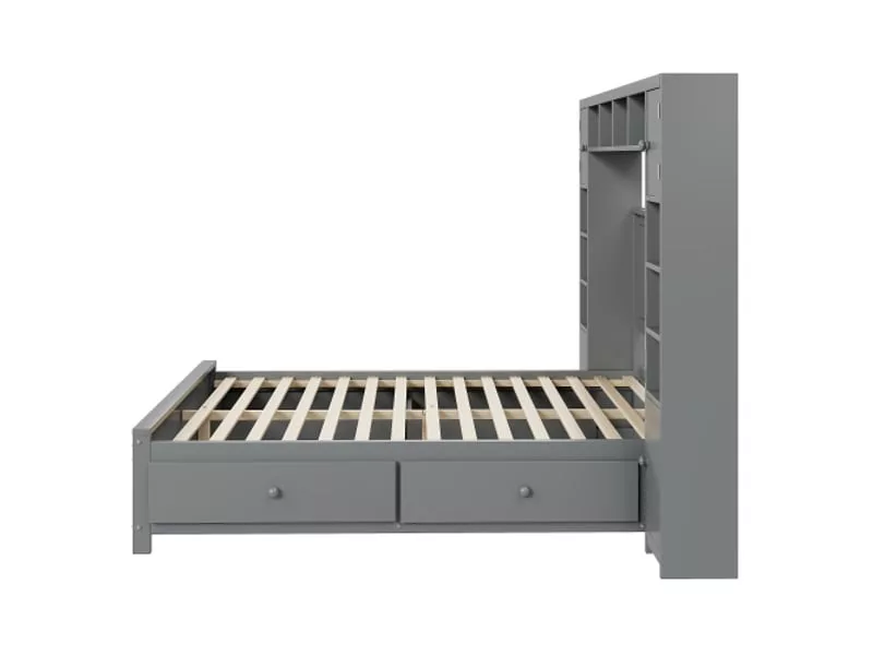 Lit double 140×200 bois massif avec 4 tiroirs et grand placard, cadre de lit avec rangement et sommier à lattes, gris