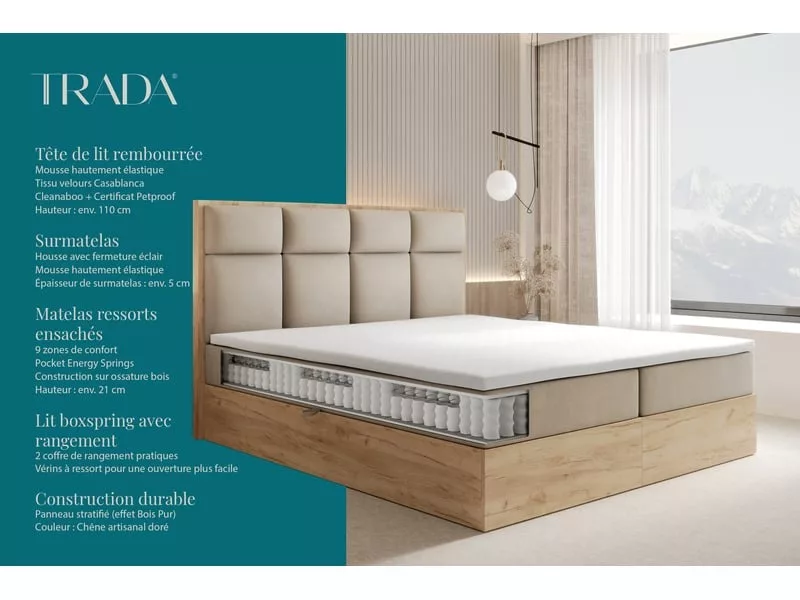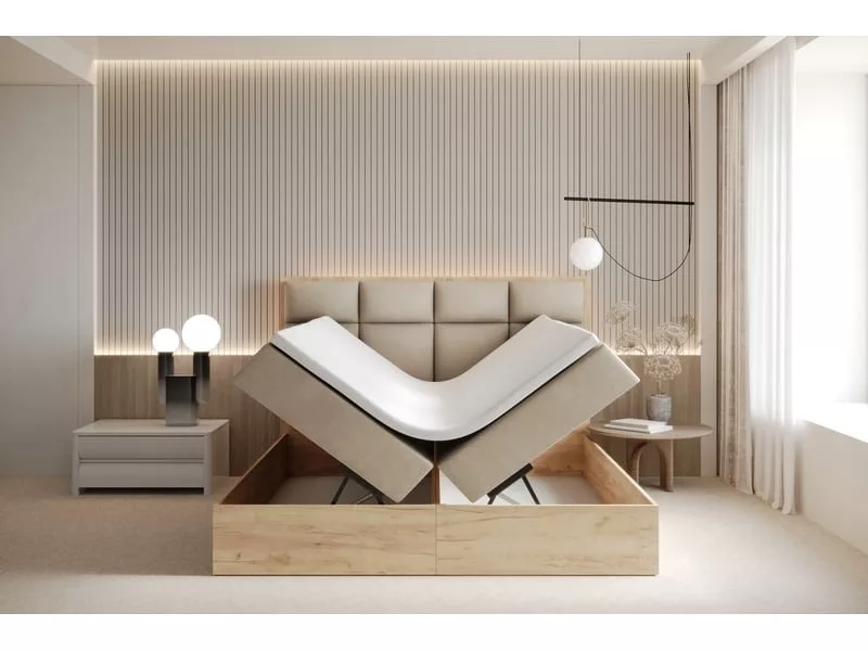 Pour avoir une chambre élégante et moderne nous vous proposons le lit adulte SELVA avec 2 coffres de rangement et matelas ressorts ensachés intégrés de haut de gamme. C’est un lit rembourré moderne et luxueux pour les utilisateurs exigeants. Matelas à ressorts ensachés H3 Pocket Energy Spring avec 9 zones de confort est intégré dans un cadre de lit en bois et en panneau stratifié très costaud. Les matelas ressorts ensachés Pocket offrent le confort et la durabilité. Cette solution permet d’obtenir de nombreux points d’appui sur la surface et assure une parfaite adaptation au corps. Matelas mi-dur H3. Hauteur matelas avec la housse : 20-21 cm. Sur le matelas il y un surmatelas avec fermeture éclair pour encore plus de confort. La housse à laver à 30°C max. Pour une ouverture facile il y a les vérins à ressort de haute qualité pour soulever le couchage. Sous le couchage vous trouverez 2 coffres à linge très spacieux. La tête de lit composée de mousse hautement élastique est rembourrée par le tissu anti-tâches Casablanca. Système de poignées en tissu situées sur les côtés du sommier pour le soulever aisément. Le cadre en bois massif constitue un excellent et très solide cadre de lit. Dimensions : Longueur : 210 cm. Largeur : 144 / 164 / 184 / 204 cm au choix. Hauteur de la tête de lit : 110 cm. Surface de couchage : 140 / 160 / 180 / 200 x 200 cm au choix. Hauteur de couchage : 48 cm + le surmatelas. Caractéristiques principales : 2x matelas à ressorts ensachés avec 9 zones de confort, H3 POCKET ENERGY SPRING. Un surmatelas pour encore plus de confort. 2 grands coffres de rangement pour la literie. Les vérins à ressort pour faciliter le levage. Cadre solide en bois massif et panneau stratifié (effet Bois Pur). Couleur du bois: Chêne artisanal doré. La tête de lit rembourrée par le tissu anti-tâches Casablanca. Le tissu se caractérise par une surface agréable et une résistance à l’abrasion. Il a des propriétés hydrofuges (Water Blocked), ce qui rend les meubles beaucoup plus faciles à nettoyer. Composition : 100 % polyester. L’arrière de la tête de lit est fabriqué en tissu Fibretex. Ce modèle existe en 4 dimensions de couchage : 140×200, 160×200, 180×200 ou 200×200 cm et dans 4 couleurs de tissu : blanc, beige, gris clair ou noir. Les couleurs des tissus et arrangements présentés peuvent différer légèrement des couleurs réelles. La saturation des couleurs dépend des paramètres de votre écran. Les meubles sont livrés par une société de transport spécialisée. Le lit est à monter soi-même. Attention : Veuillez vérifier les dimensions de colis avant l’achat. Dimensions de l’emballage : 3 colis (par exemple 200 x 200 cm) : 1x 205x112x14 cm (tête de lit). 2x 103x202x48 cm (2 coffres avec matelas intégrés)