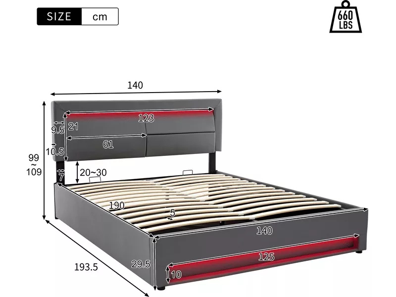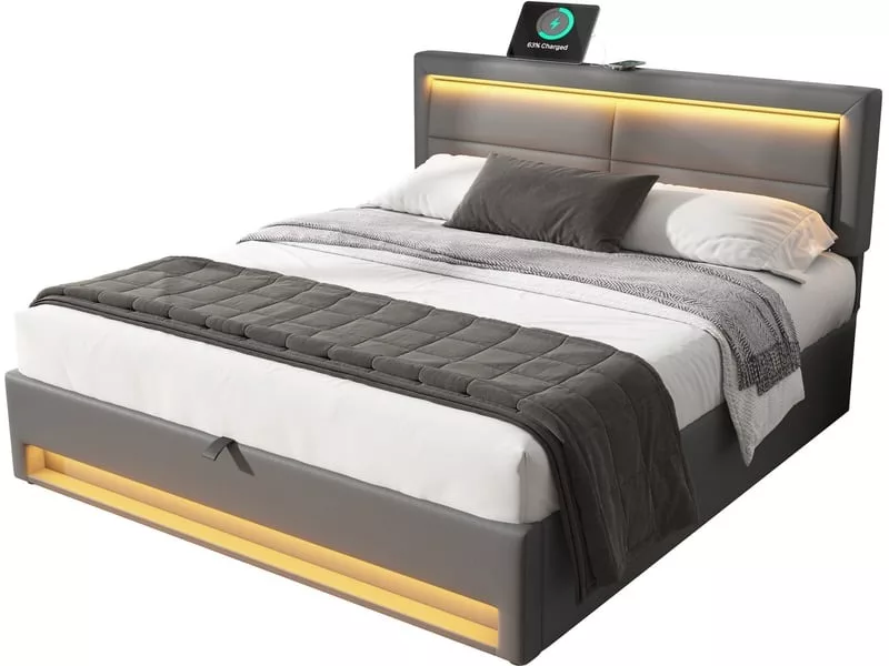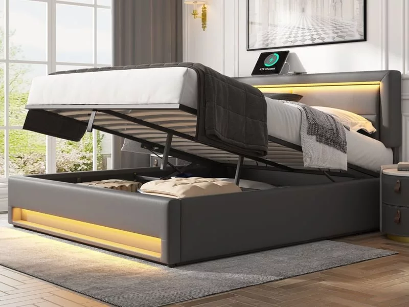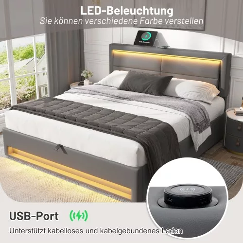 🔴[DESIGN MULTIFONCTIONNEL] Le lit rembourré est un meuble de chambre à coucher multifonctionnel avec de multiples fonctions telles que le port de chargement USB, l’éclairage LED et l’espace de rangement. En position relevée, deux ports USB sont visibles et permettent la recharge par câble. En position abaissée, les produits électroniques peuvent être placés directement dessus, ce qui permet de les recharger sans fil.