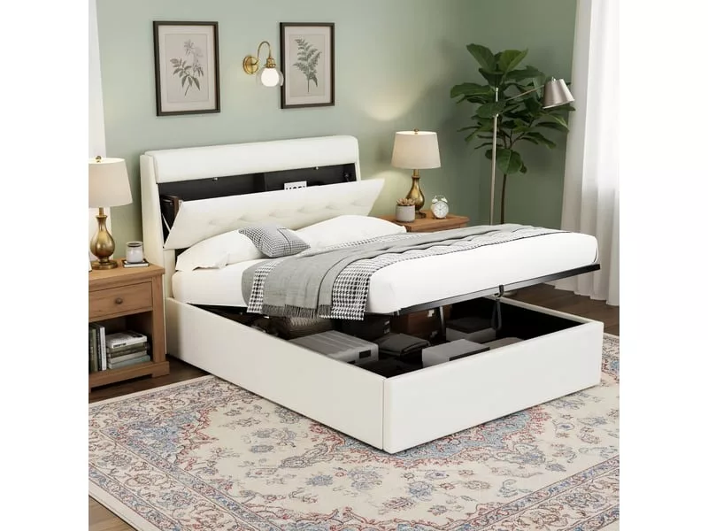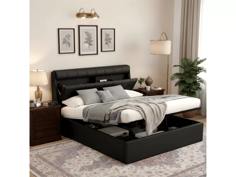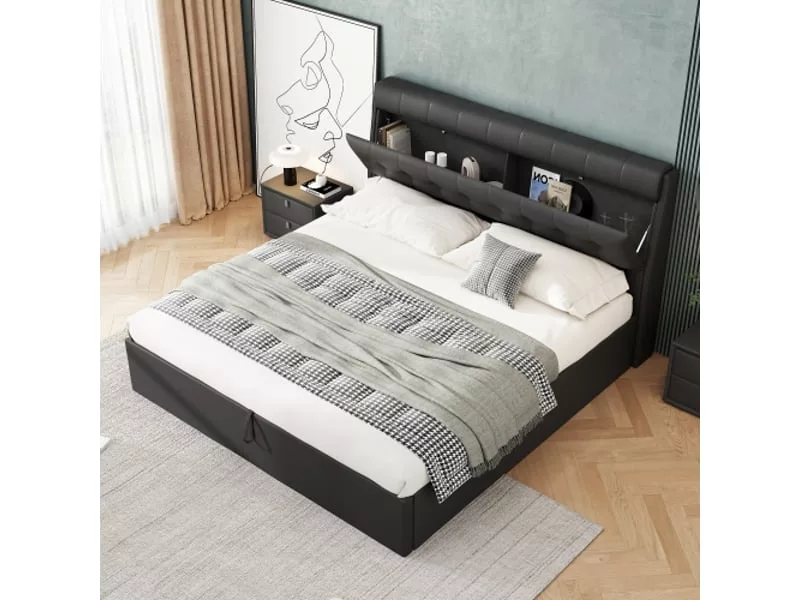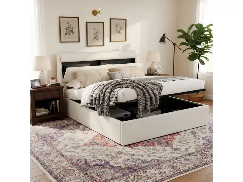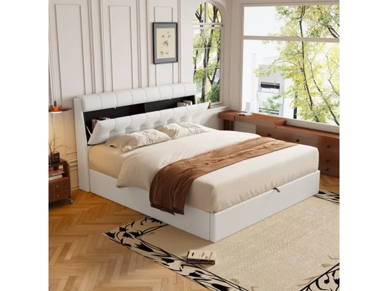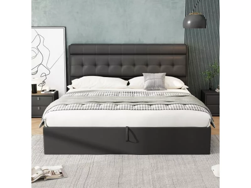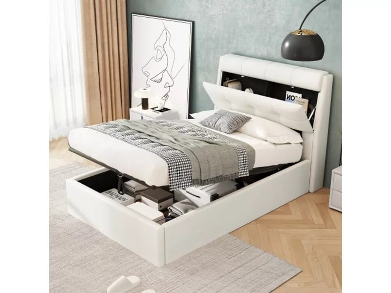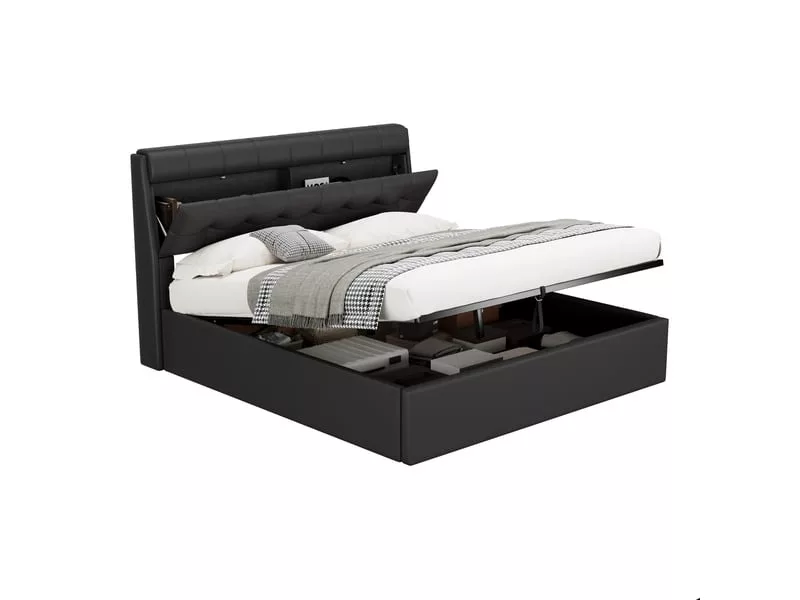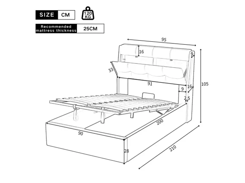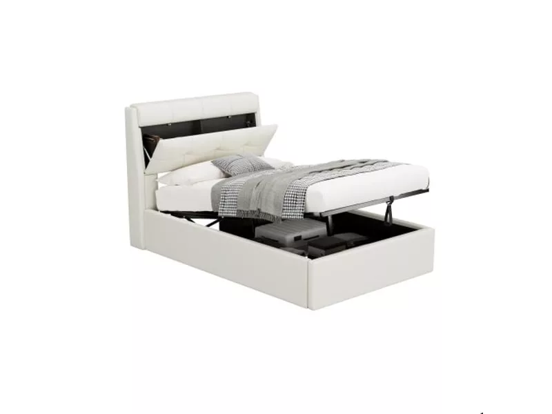 CADRE DE SUPPORT DE LIT HYDRAULIQUE : Le cadre de lit hydraulique vous permet de soulever facilement le matelas pour utiliser l’espace de rangement dans le coffre de lit. Facile à utiliser, économique et efficace.