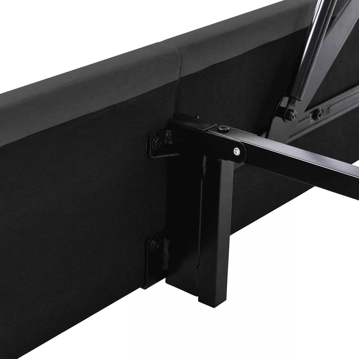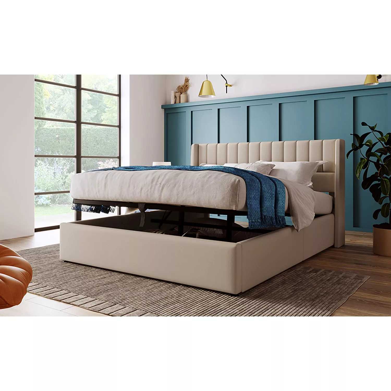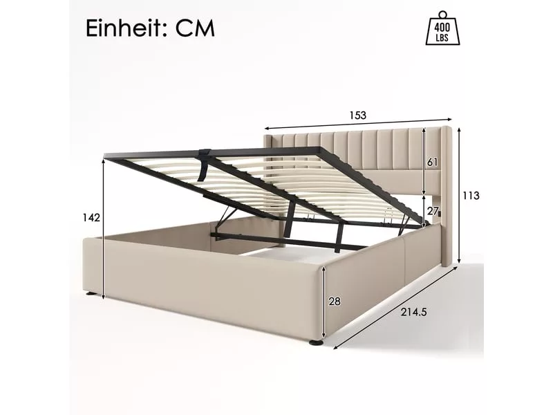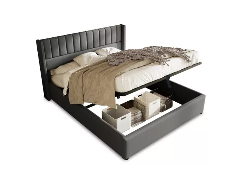 Grand coffre de lit sous le sommier relevable avec beaucoup d’espace de rangement pour les couvertures, les oreillers ou les draps, sommier facilement relevable grâce au vérin de levage.