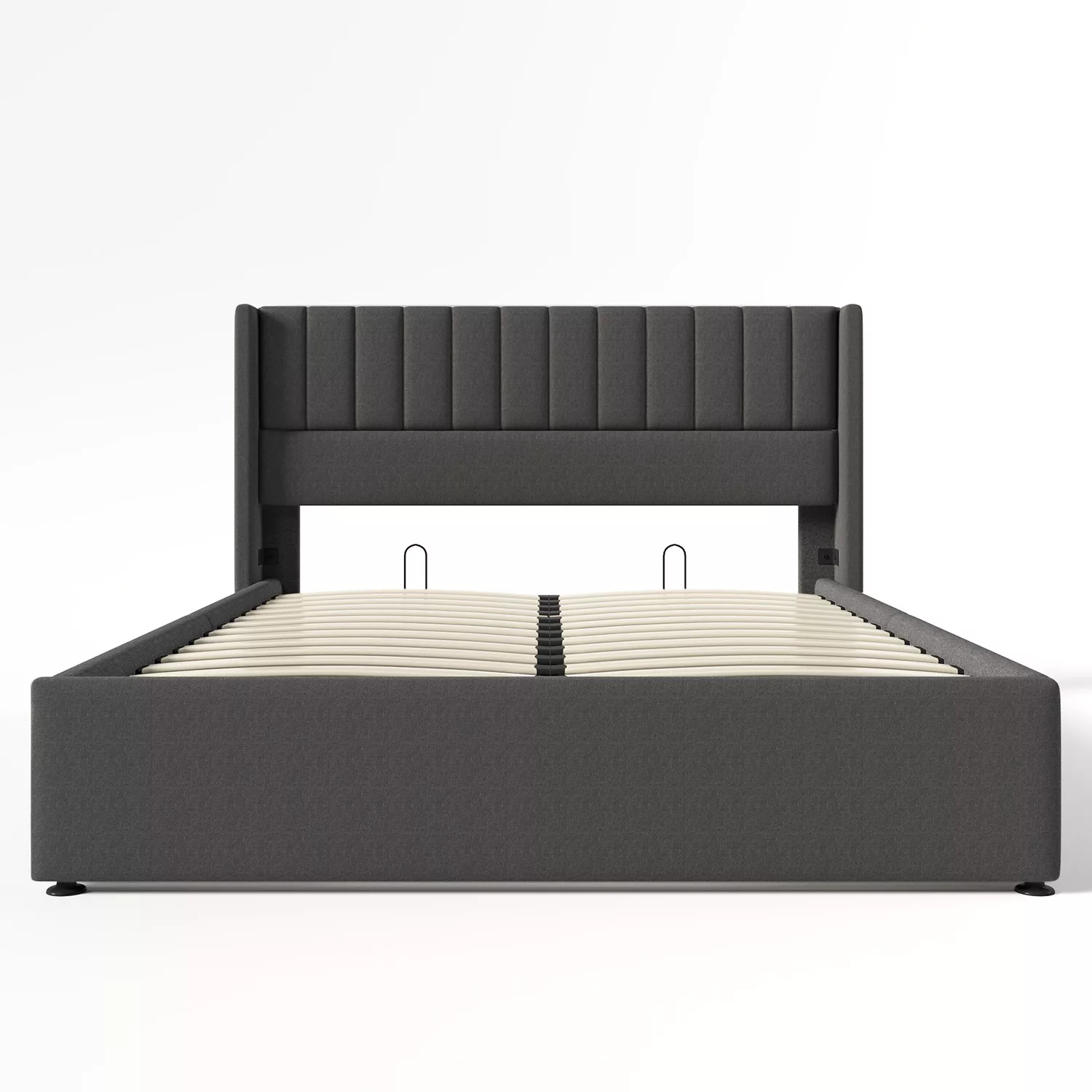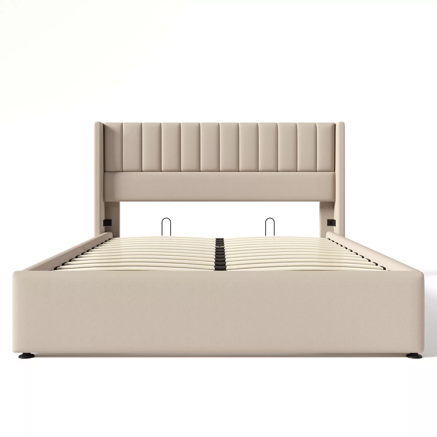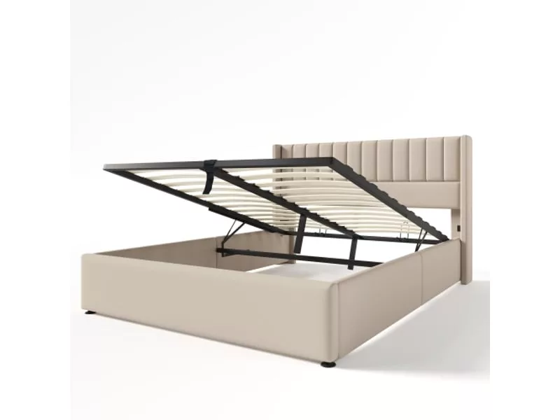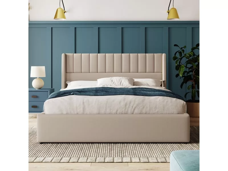 Le design à rayures verticales de la tête de lit apporte une touche créative au design. La barre latérale incurvée de la tête de lit est à la fois esthétique et pratique, car elle empêche le matelas de glisser. Ce lit est disponible en deux couleurs : gris et beige.