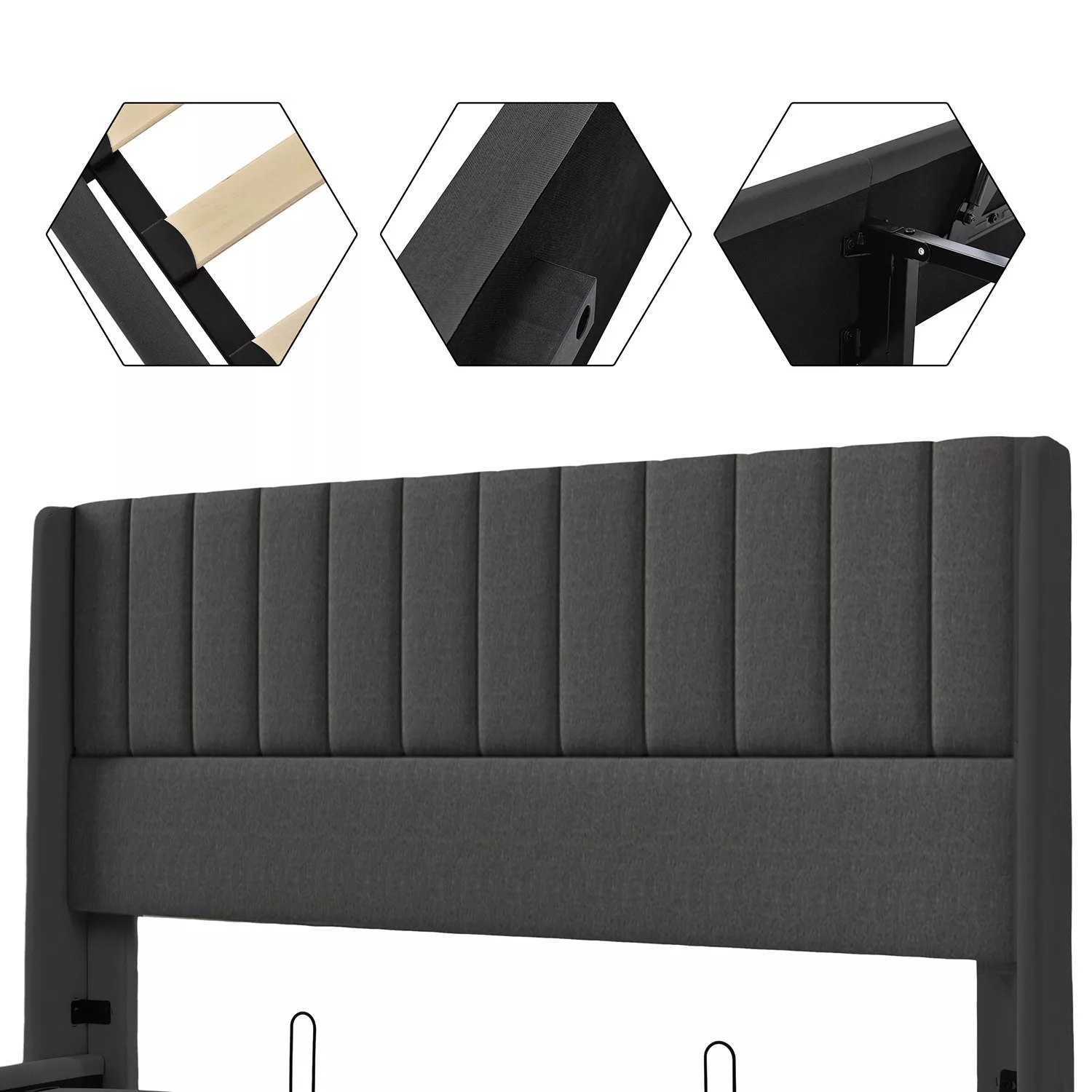 Le produit est également équipé d’une sangle de traction en tissu pour faciliter le levage et l’abaissement de la base hydraulique. Tête de lit rembourrée vous permet de lire confortablement un livre dans le lit, donne à votre dos un soutien confortable.