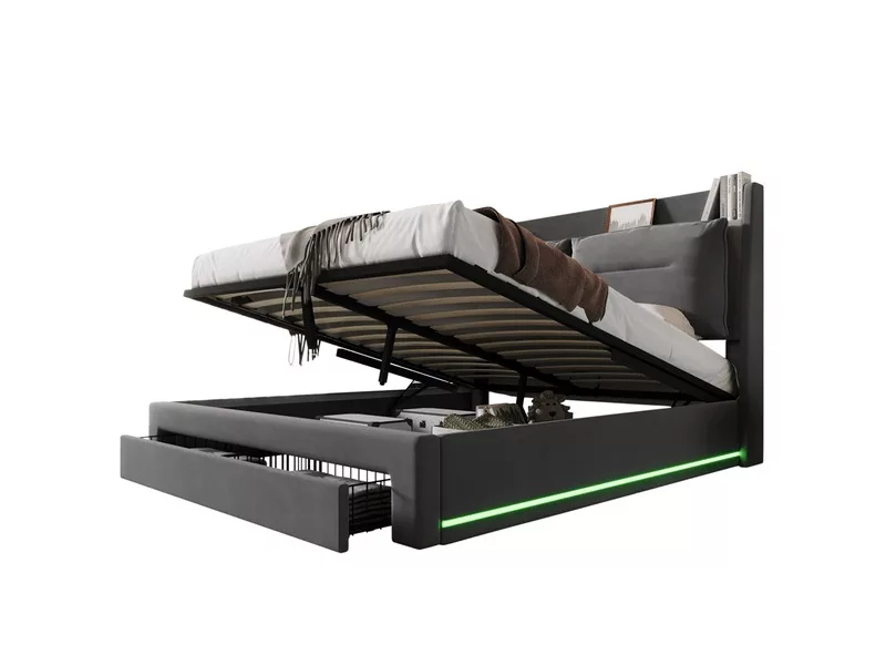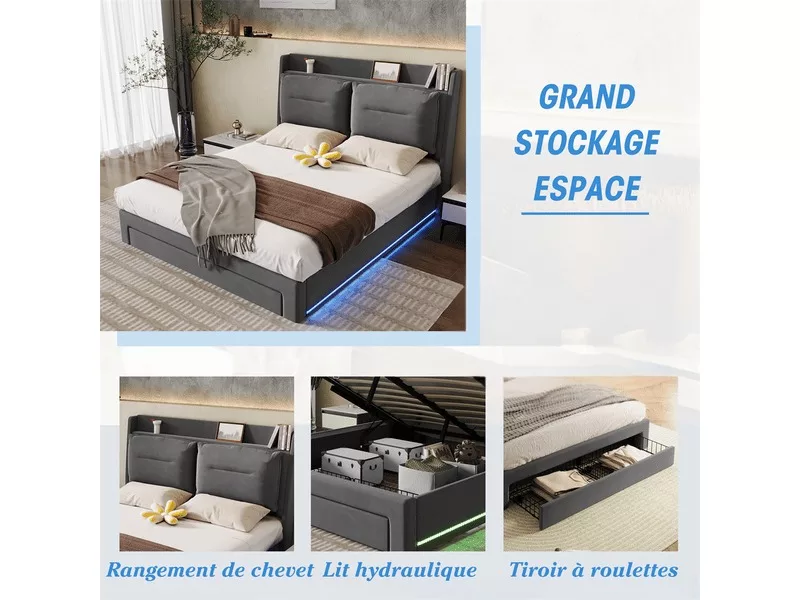 Ce lit dispose d’une variété de fonctions de rangement, notamment un lit de rangement hydraulique, un tiroir de rangement 2 en 1 à l’extrémité du lit et une tête de lit. Ces espaces de rangement vous offrent des options de rangement pratiques qui vous permettent d’utiliser l’espace de manière efficace et de garder votre chambre à coucher rangée et organisée.