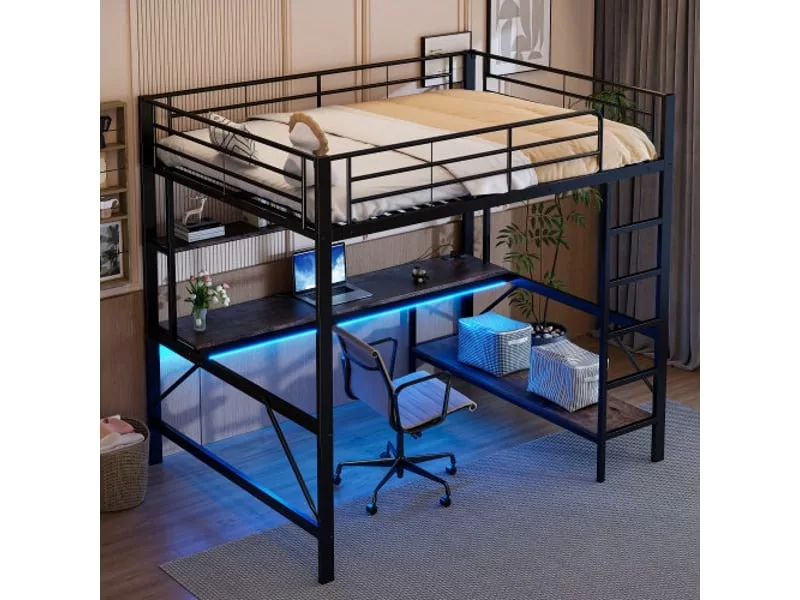 Lit mezzanine-140 x 200cm-avec prise usb, avec éclairage led, bureau, étagère-noir